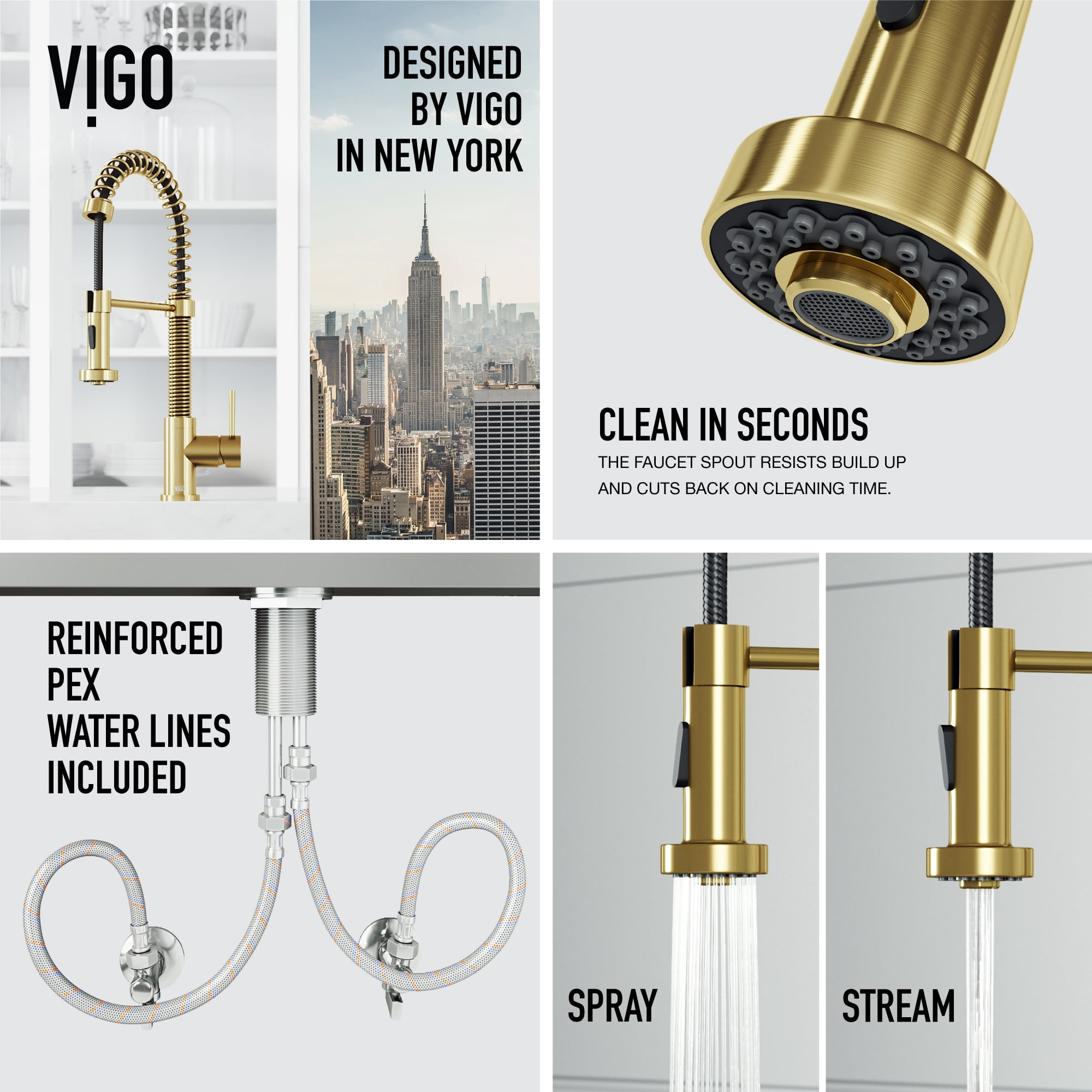 PERFORMANCE SPOUT TM: eco-friendly spout conserves water and reduces your water bill without sacrificing water pressure SWIVEL SPOUT TM: a 360-degree rotating faucet provides exceptional maneuverability making cooking and cleaning in the kitchen effortless ETERNAL SEAL TM: an expertly tested ceramic cartridge that prevents leaks and dripping FINISH PLATED TM: ensures the hardware finish is consistent throughout and guaranteed to match all other VIGO products DUAL-ACTION SPRAY HEAD: the multifunctional pull-down sprayer delivers an aerated flow of water or a powerful spray with the click of a button SECURE DOCKING: Sprayer Docking Station pulls the sprayer into place to secure it when not in use SINGLE HANDLE LEVER: one lever effortlessly controls the water pressure and temperature EASY TO CLEAN: the nozzle resists mineral buildup, making this kitchen faucet easy to clean EXTENDABLE HOSE: A retractable hose of up to 30 inches features a nylon braided hose for additional ease of use EXCEPTIONAL HARDWARE: Sedal ceramic disc valve has been tested for 500,000 uses UNMATCHED DURABILITY: solid brass construction and premium quality parts make this kitchen faucet tough, strong, and easy to clean PREMIUM FINISH: VIGO’s 7-layer coating ensures long-lasting brilliance that resists rust, corrosion and tarnish