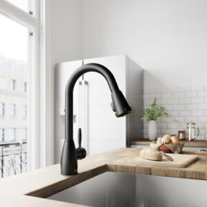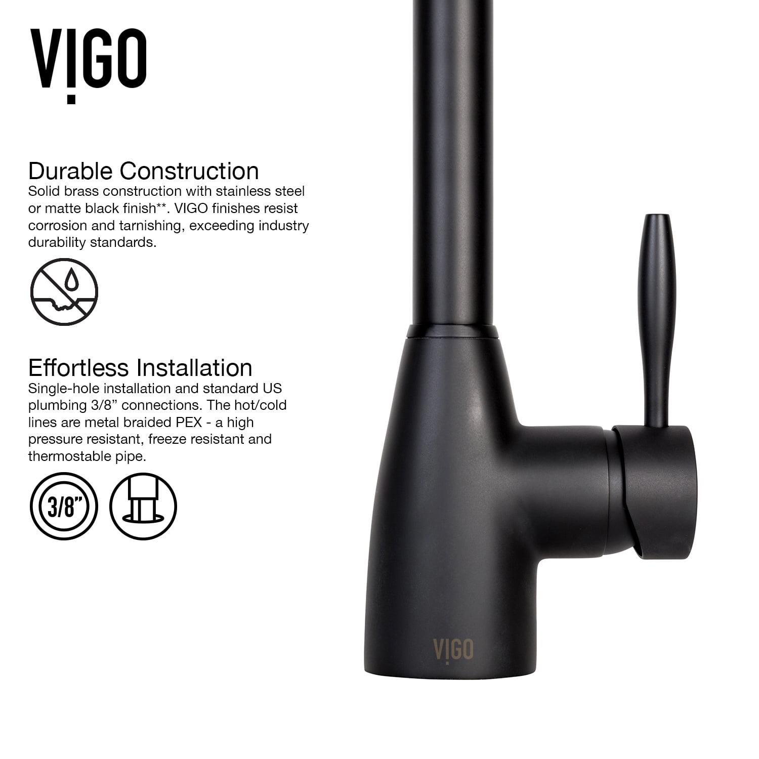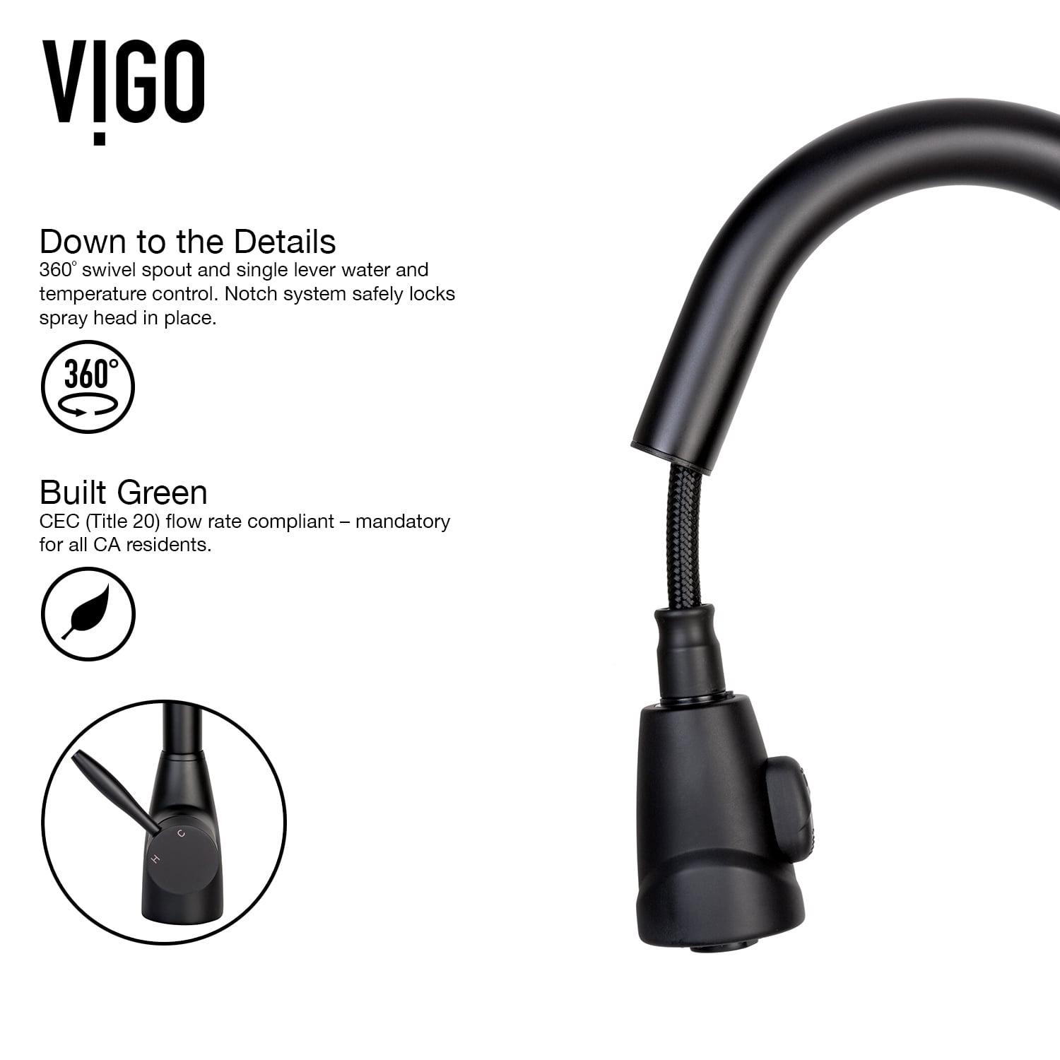 The VIGO Graham Pull-Down Spray Kitchen Faucet is a smart, highly functional addition to any modern kitchen. It features a dual action, pull-down spray head that swivels 360° and a spout that extends up to 30 inches long. Solid brass construction and a matte black finish resists corrosion and ensures longevity.