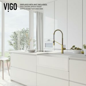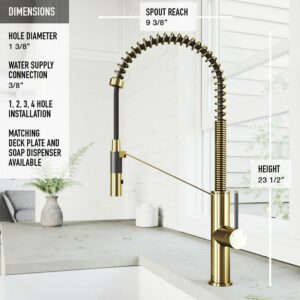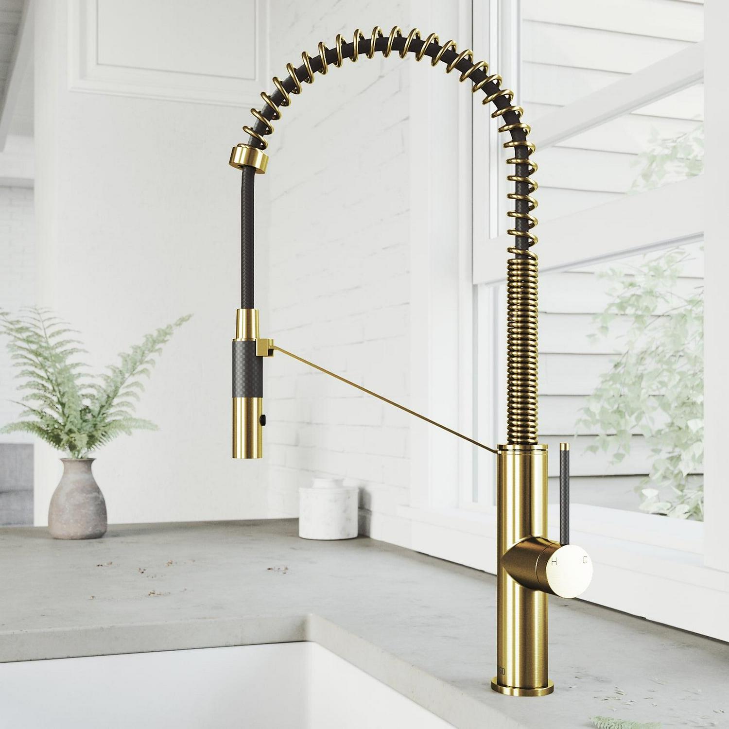 With its sleek design and modern spiral details, the VIGO Livingston Magnetic Kitchen Faucet is the perfect functional fixture for your kitchen. The single handle kitchen faucet features a professional look with an easy to clean spray face. The pull-down spray head switches from aerated flow to spray at the touch of a button for powerful cleaning. The Livingston features an integrated magnetic DockLock catch to hold the spray head in place when not in use. It is made with top of the line hardware and operated by a single lever to control the water volume and temperature controls. With a bright, matte brushed gold finish plated in 7 layers for longevity, this faucet does it all.