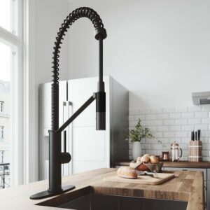 With its sleek design and modern spiral details, the VIGO Livingston Magnetic Kitchen Faucet is the perfect functional fixture for your kitchen. The single handle kitchen faucet features a professional look with an easy to clean spray face. The pull-down spray head switches from aerated flow to spray at the touch of a button for powerful cleaning. An integrated magnetic catch holds the spray head in place when not in use for additional convenience. A matching deck plate allows this faucet to be installed with 1,2,3, or 4-hole installations.