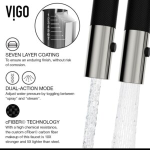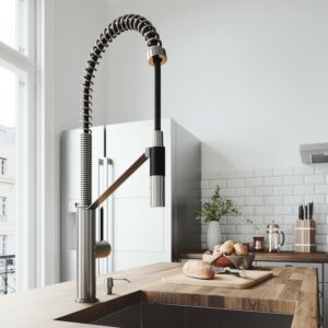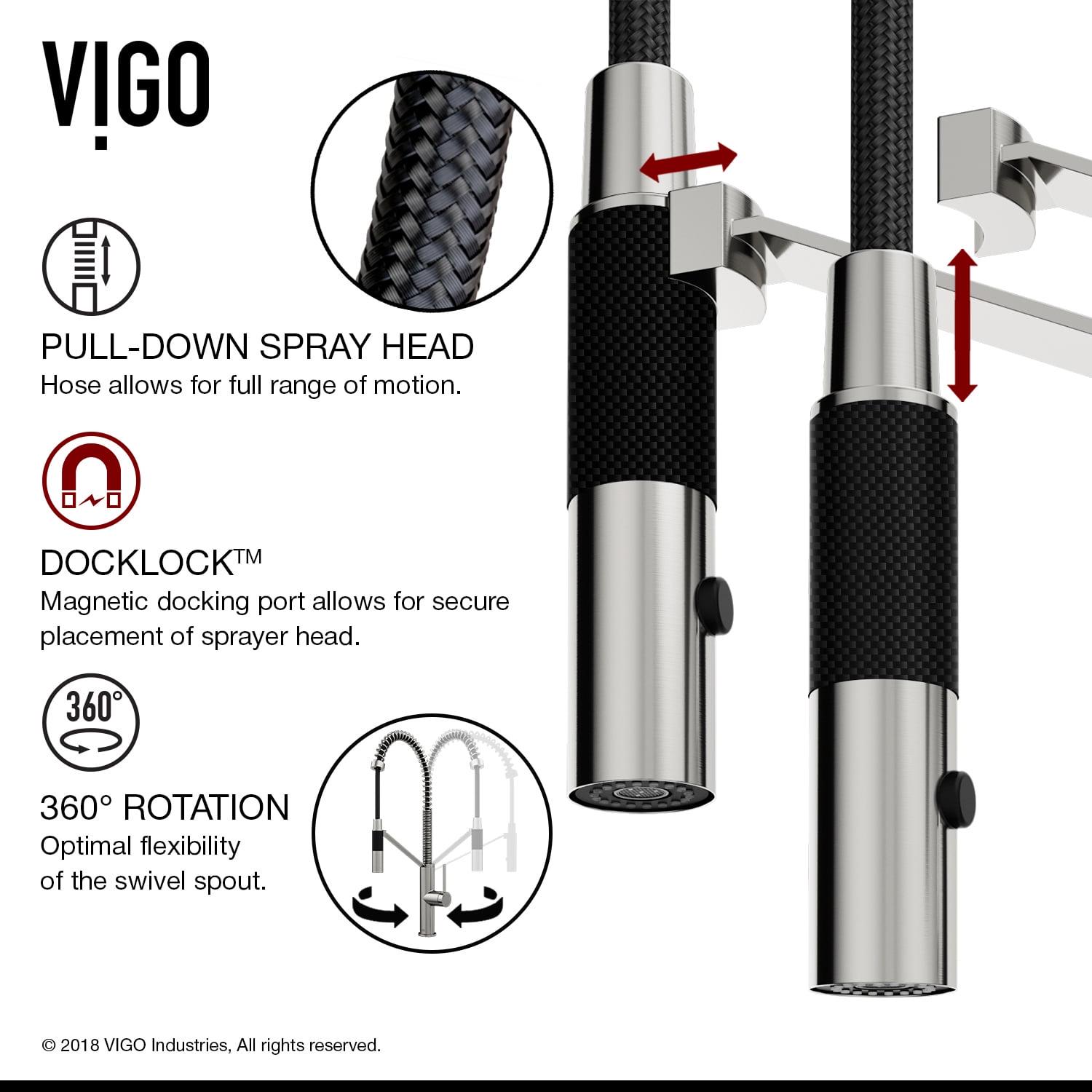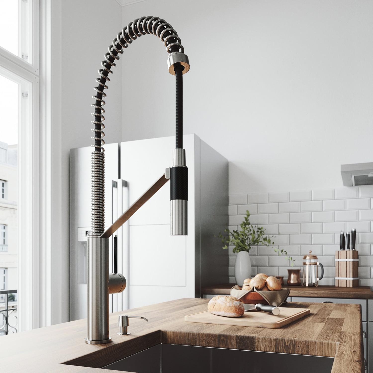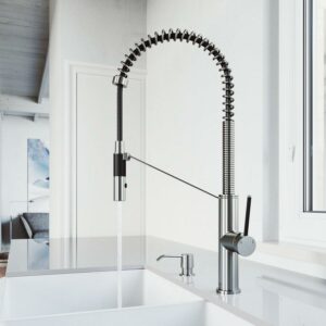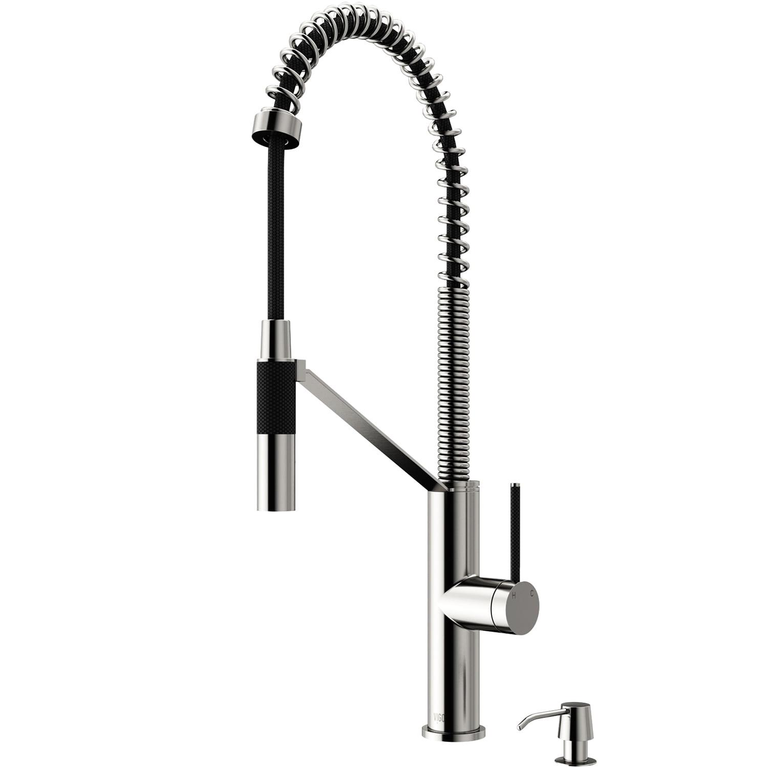 With its sleek design and modern spiral details, the VIGO Livingston Magnetic Kitchen Faucet is the perfect functional fixture for your kitchen. The single handle kitchen faucet features a professional look with an easy to clean spray face. The pull-down spray head switches from aerated flow to spray at the touch of a button for powerful cleaning. An integrated magnetic catch holds the spray head in place when not in use for additional convenience. A matching soap dispenser with an above-counter pump and below counter 12 ounce reservoir offers is included in this set.