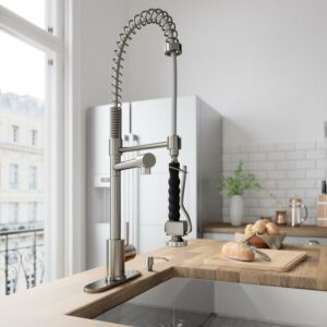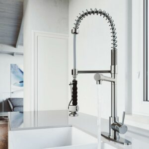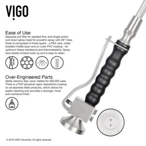 The VIGO Zurich Pull-Down Spray Kitchen Faucet features a pull-down spray head that can extend up to 28 inches, along with a separate pot filler, making it highly functional in any kitchen. Constructed from durable solid brass, this beautiful commercial-style kitchen faucet is a must-have in any home. This faucet features an easy-grip handle for simple maneuverability in and around the sink. It also has a matching deck plate to allow for simple transformation from a 1, 2, 3 or 4-hole installation.