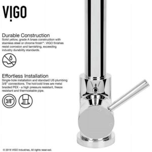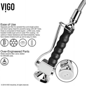 The VIGO Zurich Pull-Down Spray Kitchen Faucet features a pull-down spray head that can extend up to 28 inches, along with a separate pot filler, making it highly functional in any kitchen. Constructed from durable solid brass, this beautiful commercial-style kitchen faucet is a must-have in any home. This faucet features easy-grip handle for simple maneuverability in and around the sink as well as a matching soap dispenser that installs above the sink completes this set.