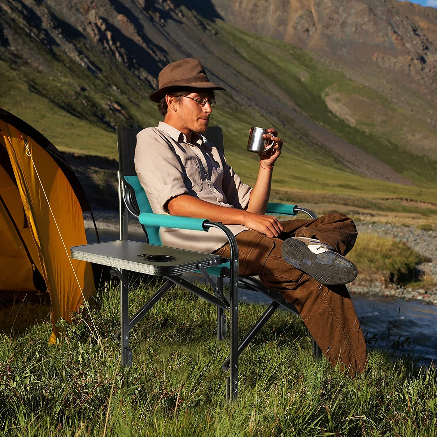 Size & Capacity – The camping folding chair measures 19-3/4″ L x 22-1/4″ W x 34-3/4″ H and weighs only 12.3 lbs. Maximum loading capacity 350 lbs for adult. Functional – Side table with a cup holder and detachable padded arm rest offer you long-lasting relaxation. 600D Oxford with solid padding and waterproof PVC coating has the advantages of anti-tear, slow aging and sun resistance. Heavy Duty – Industrial grade iron ensures a higher compressive strength than aluminum. The powder-coated and bolded frame is heavy-duty, anti-rust and anti-corrosion. Portable – This directors chair can be set up and folded in seconds. The chair can be stored at 4-1/4″ x 19-5/8″ x 34 5/8″, and can be stored almost anywhere. Multi-Purpose – Whether you’re a director or makeup artist, or it’s camping, lawn, picnic, tailgating, beach, or sports games, VILLEY portable camping directors chairs always meet your needs.