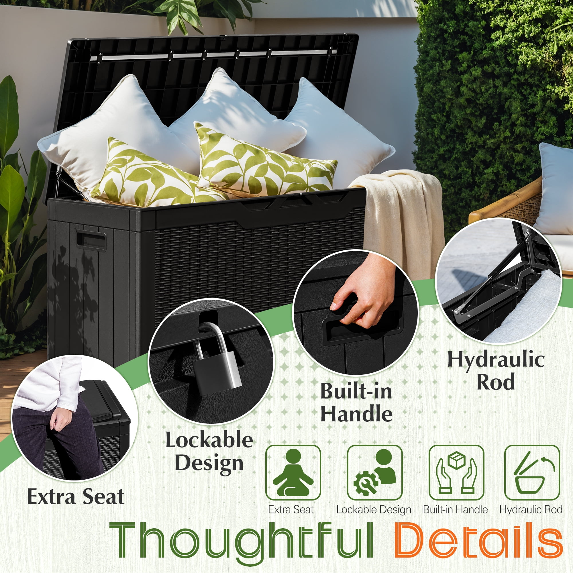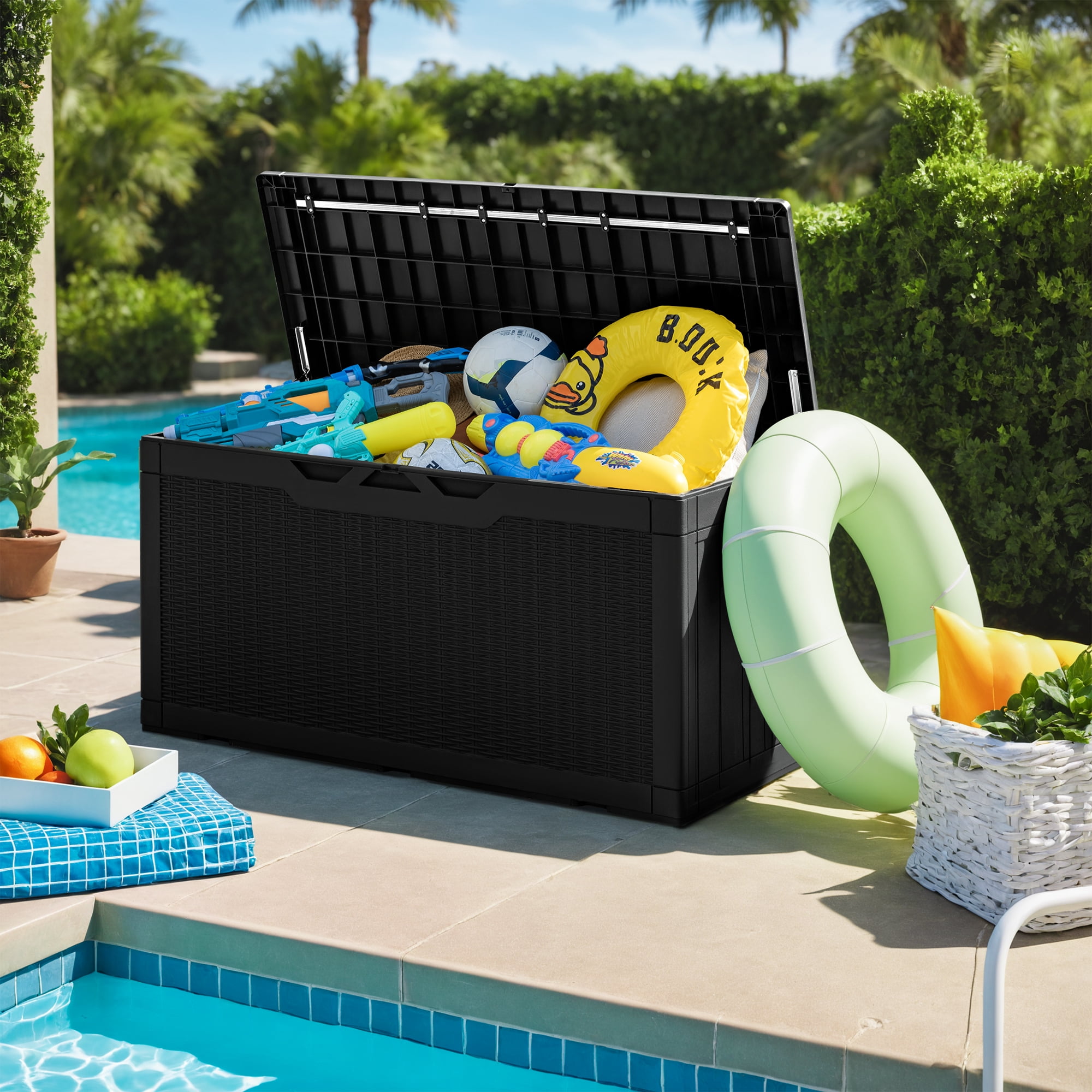 HIGH QUALITY MATERIAL:This storage box is made of weather-resistant polypropylene resin, which is fade-resistant, rust-resistant, flake-resistant, bend-resistant, and durable. EXTRA LARGE STORAGE CAPACITY: Vineego deck box has a 100 gallon storage capacity, perfect for organizing your outdoor space. It can be used to store outdoor furniture cushions, pool toys, garden tools. THOUGHTFUL DESIGN: The deck box lid has two hydraulic levers that gently open and close to prevent hand trapping. The lockable lid keeps your belongings safe.