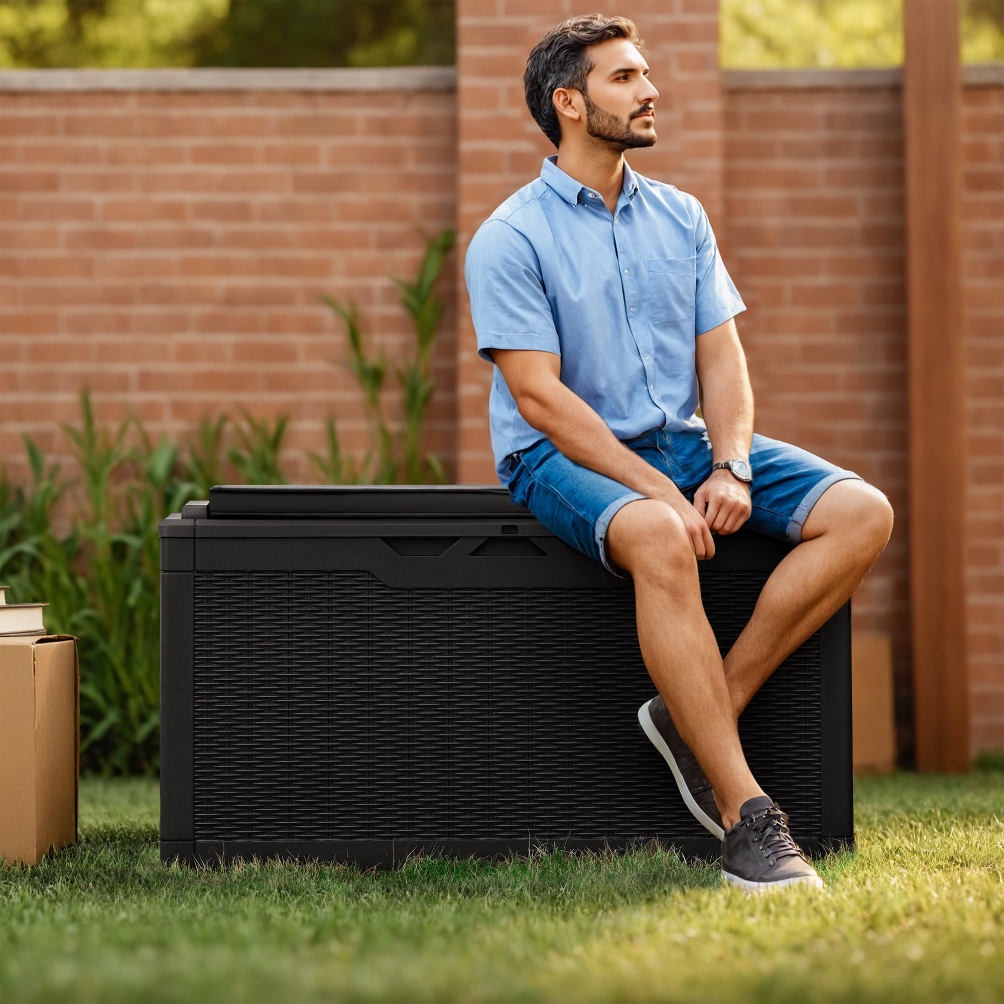 Vineego Classic Outdoor 100 Gallon Resin Deck Box with Cushions, Lockable Storage Container, Black