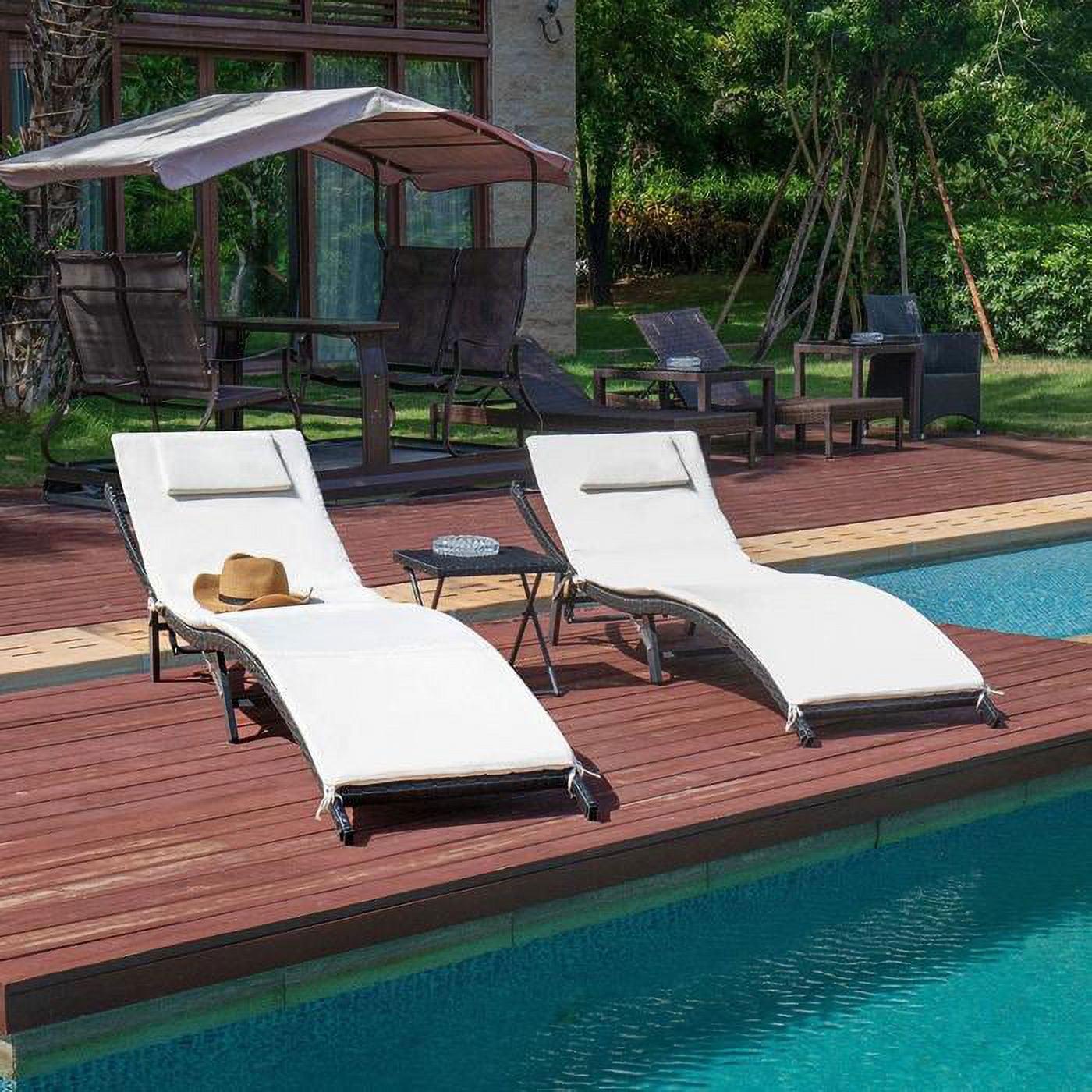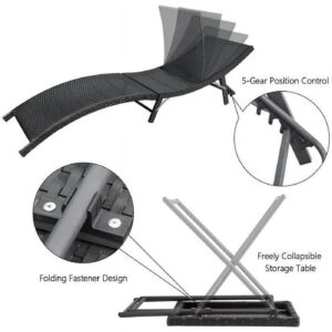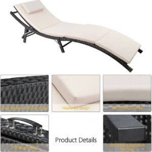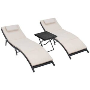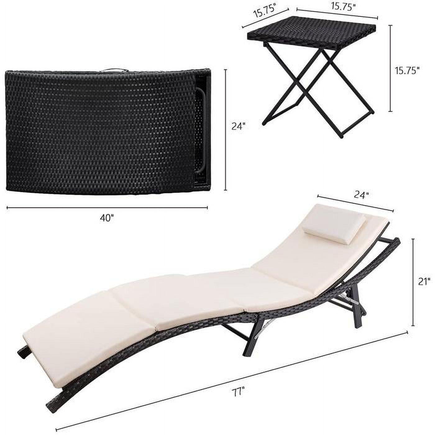Vineego 3 PCS Patio Furniture Outdoor Patio Lounge Chair Adjustable Folding Lawn Poolside Chaise Lounge Chair PE Rattan Patio Seating with Folding Table and Beige Cushion