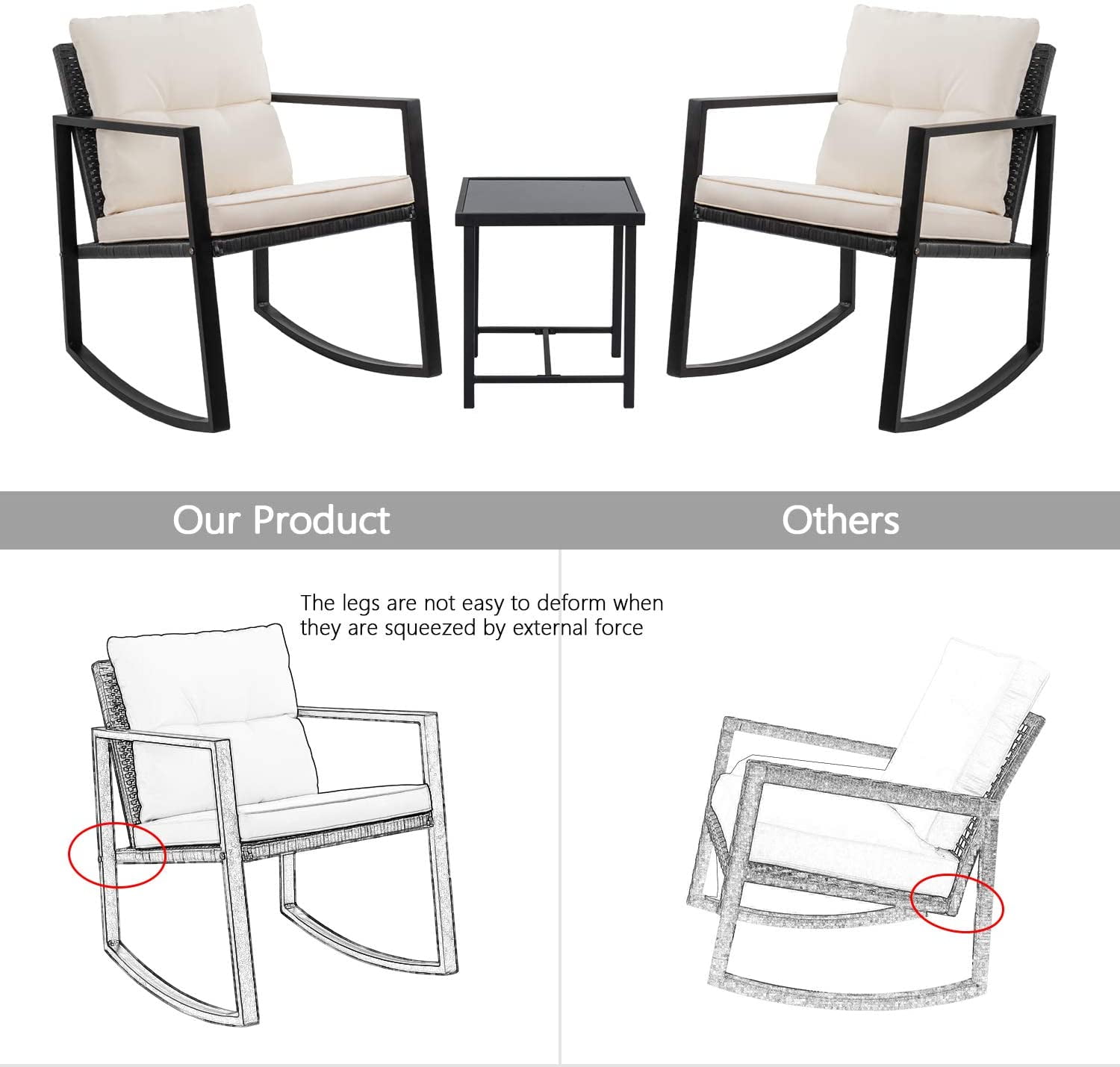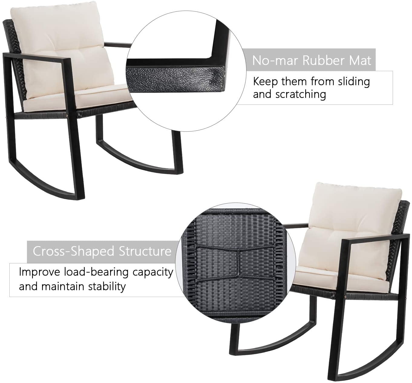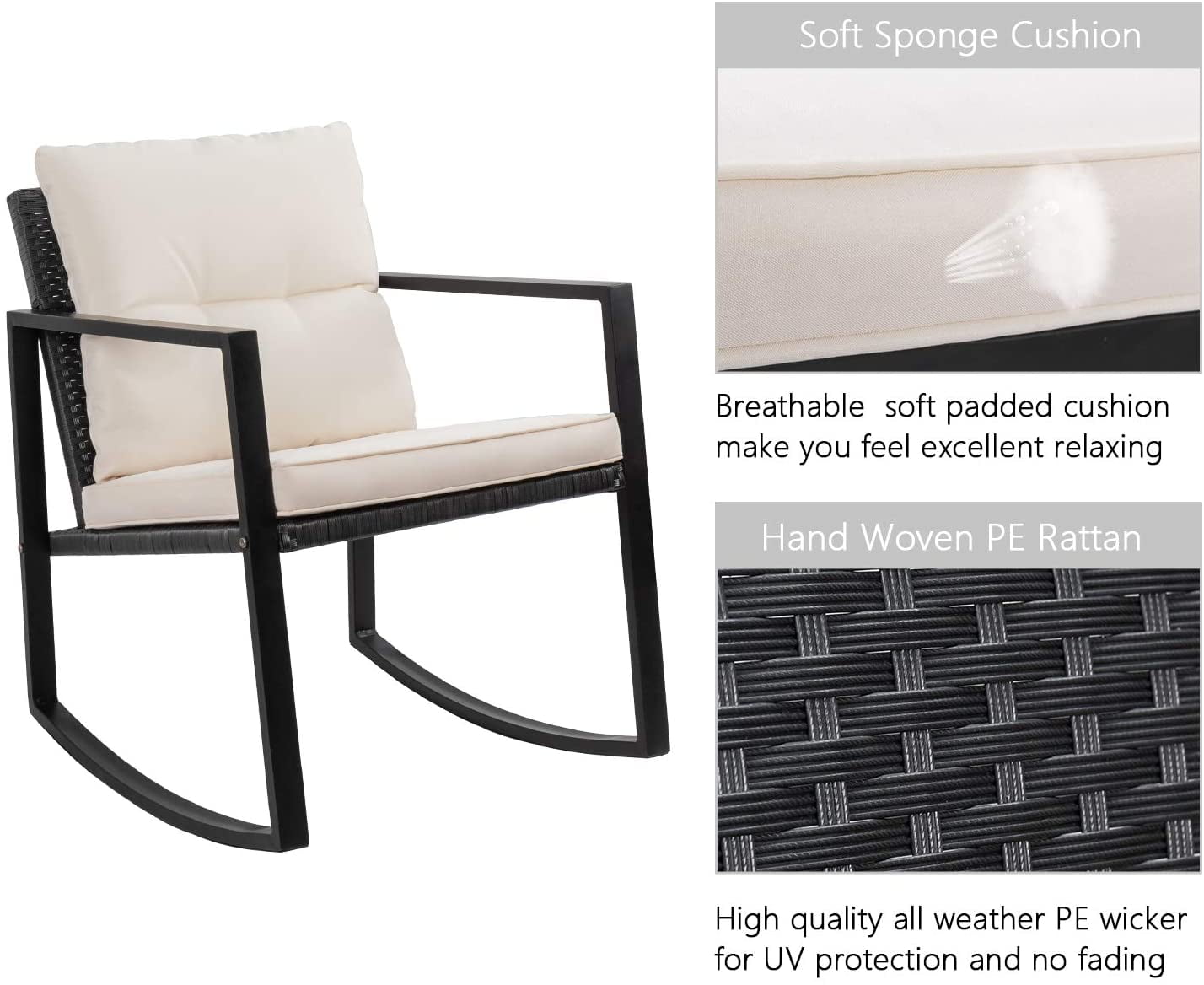 Sturdy and Durable: The metal frame provides strong support, and the connection design of the leg and seat makes the product more stable. The cross structure at the bottom improves the load capacity of the chair. The powder coating on the frame makes the product not easy to rust, and with the anti-uv PE rattan that is not easy to fade, it can adapt to various weather changes Easy to clean: The cushions are detachable for easy cleaning. The table is equipped with high-strength tempered glass. In addition to placing a variety of items, it is also very easy to wipe. You no longer have to worry about accidentally knocking over drinks Enjoy leisure time: The thickened cushion filled with high-density sponge makes the product softer, and the wide and deep chair makes you sink into it. Just rock it to relax and enjoy the life Intimate design: Rubber pads are added to the chairs and tables, which not only prevents sliding but also reduces various possible scratches Specifications: Frame: Steel Rattan Material: PE Wicker Rattan Color: Black Weight Capacity: 285 pounds Cushion: Polyester fabric and sponge padded Dimensions: Armchair: 28.5″ (L)x 23″ (W)x 36″ (H) Table: 17″ (L)x 17″ (W) x 19″ (H) Tempered glass top: 16″ (L)x 16″ (W) Cushion for armchair: 22″ (L)x 20″ (W) Product Including: 2 x Rocking chair 1 x Coffee table 1 x Tempered glass top 2 x Back cushion 2 x Seat cushion