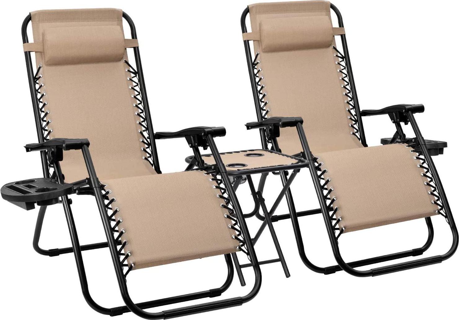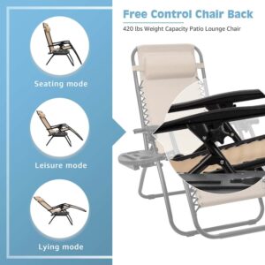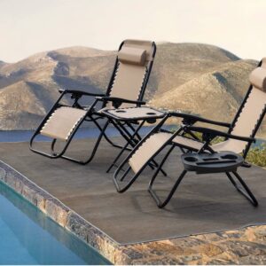 Vineego 3 Pieces Zero Gravity Chair Patio Foldable Chaise Lounge Chairs 2 Beach Chairs and Table with Cup Holders,Beige