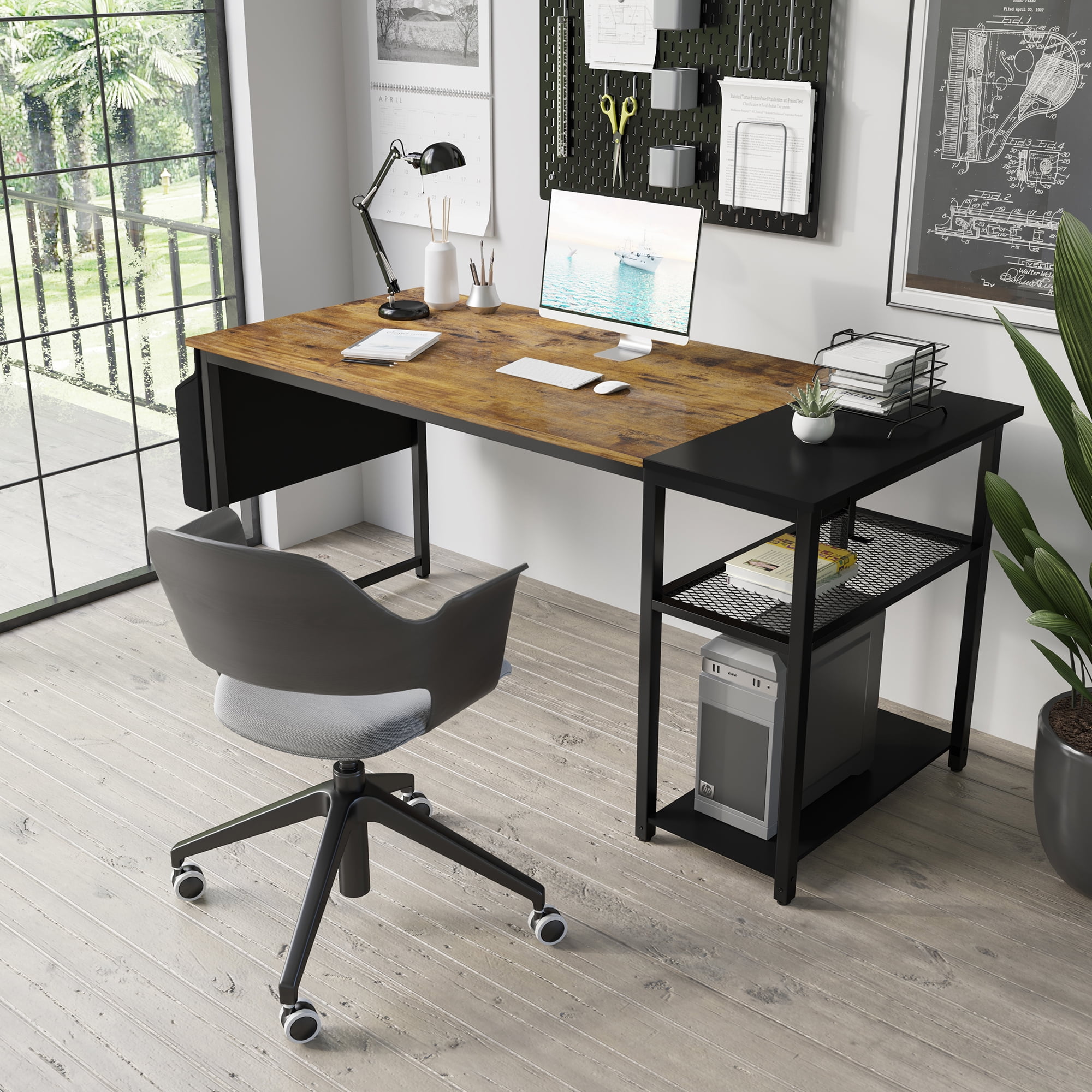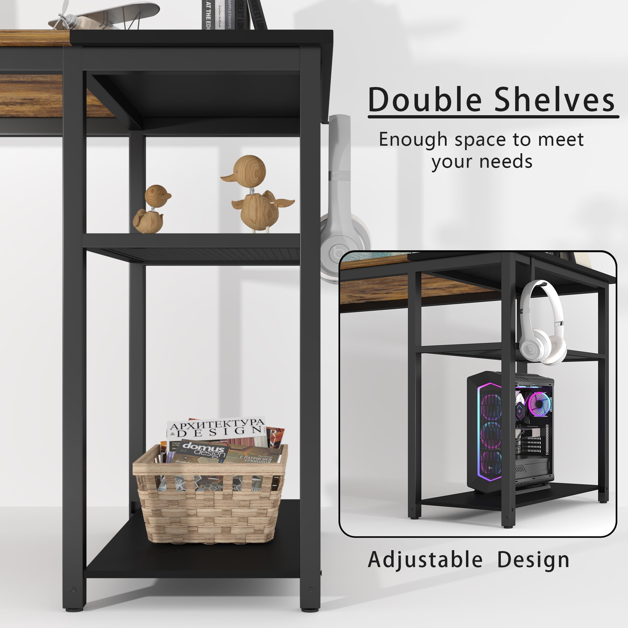 Vineego 47 inch Home Office Computer Desk with Side Pocket,Headphone Hook and Storge Shelves(Rustic Brown)