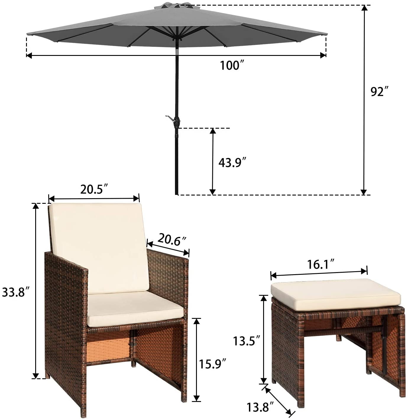Features: 1. Luxurious Outdoor Furniture Patio Set: This set is including 2 single armchairs, 2 ottomans and 1 umbrella. Perfect for 2~4 friends relax in the garden. 2. Dual-purpose Patio Footrest Design: The footrest is not only can relieve pressure on the legs and promote blood circulation in the legs, but also can be used as an extra chair for more friends. 3. Sturdy Frame & Tightly Woven Wicker: All-weather PE rattan wicker is fade resistant and UV protected, ensures the appearance long-lasting. The sturdy and rust-proof frame ensures extra support and durability for the set. 4. Ergonomically Designed Patio Set: Ergonomically designed, wide and deep enough seat, an angled backrest, and slightly downward handrail for extraordinary comfort, let you relax your body from back to butt. 5. Perfect Patio Decor: The classic rattan sofa set is perfect for your patio, porch, garden, lawn, backyard, etc. 6. Soft Removable Cushion: The removable cushion covers with zippers can be easily taken off for regular cleaning to keep the furniture looking new and beautiful. Specifications: Material: PE Rattan, Steel Frame, Sponge Armchair Dimension: 20.5″ W x 20.6″ D x 33.8″ H Seat Size: 20.5″ W x 20.6″ D Seat Height: 15.9″ Ottoman Dimension: 16.1″ L x 13.8″ W x 13.5″ H Umbrella Dimension: 100″ DIA x 92″ H Weight: 47.8 lbs (armchair& ottoman), 12.2lbs (umbrella) Cushion Thickness: 4″ Note: 😊If you have any questions, please feel free to contact us~Customer service email: [email protected] None of the cushions support machine washing, which can cause stitches to break. There are 2 boxes that you will receive, the transportation speed is about 3-10 days normally.