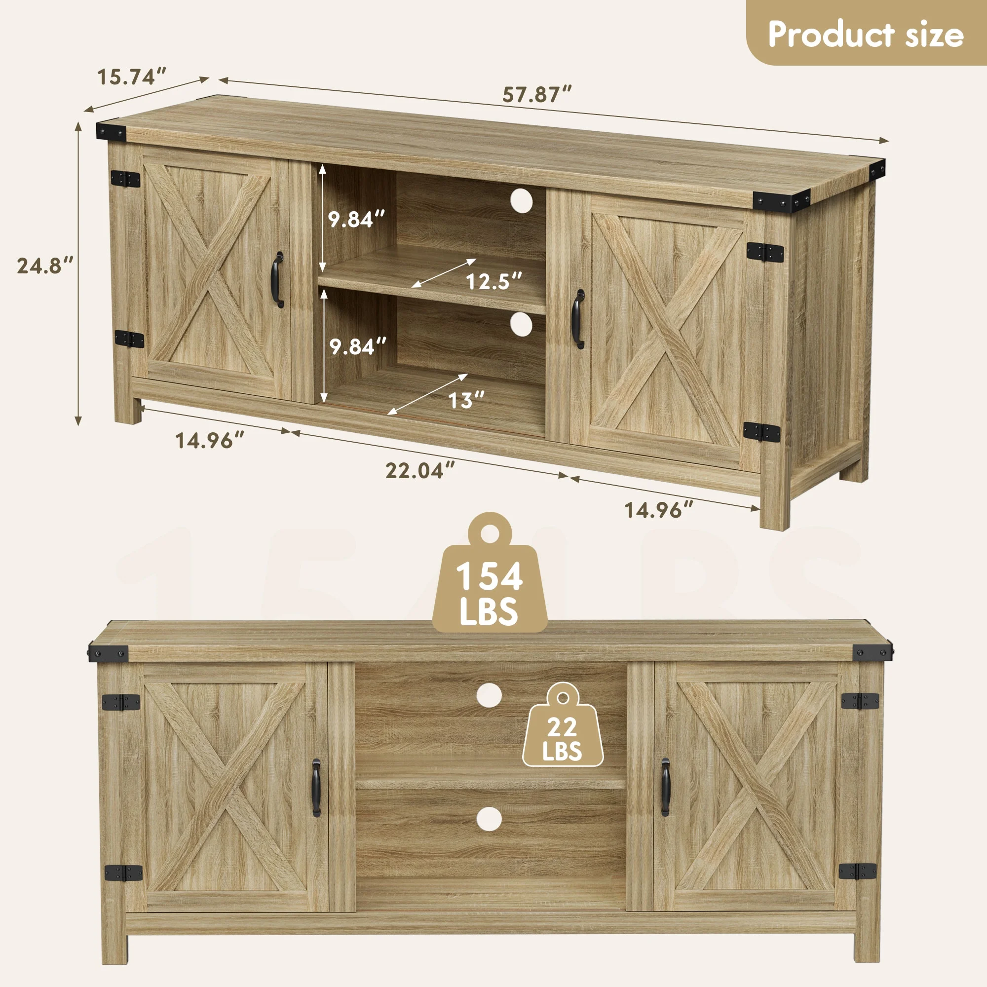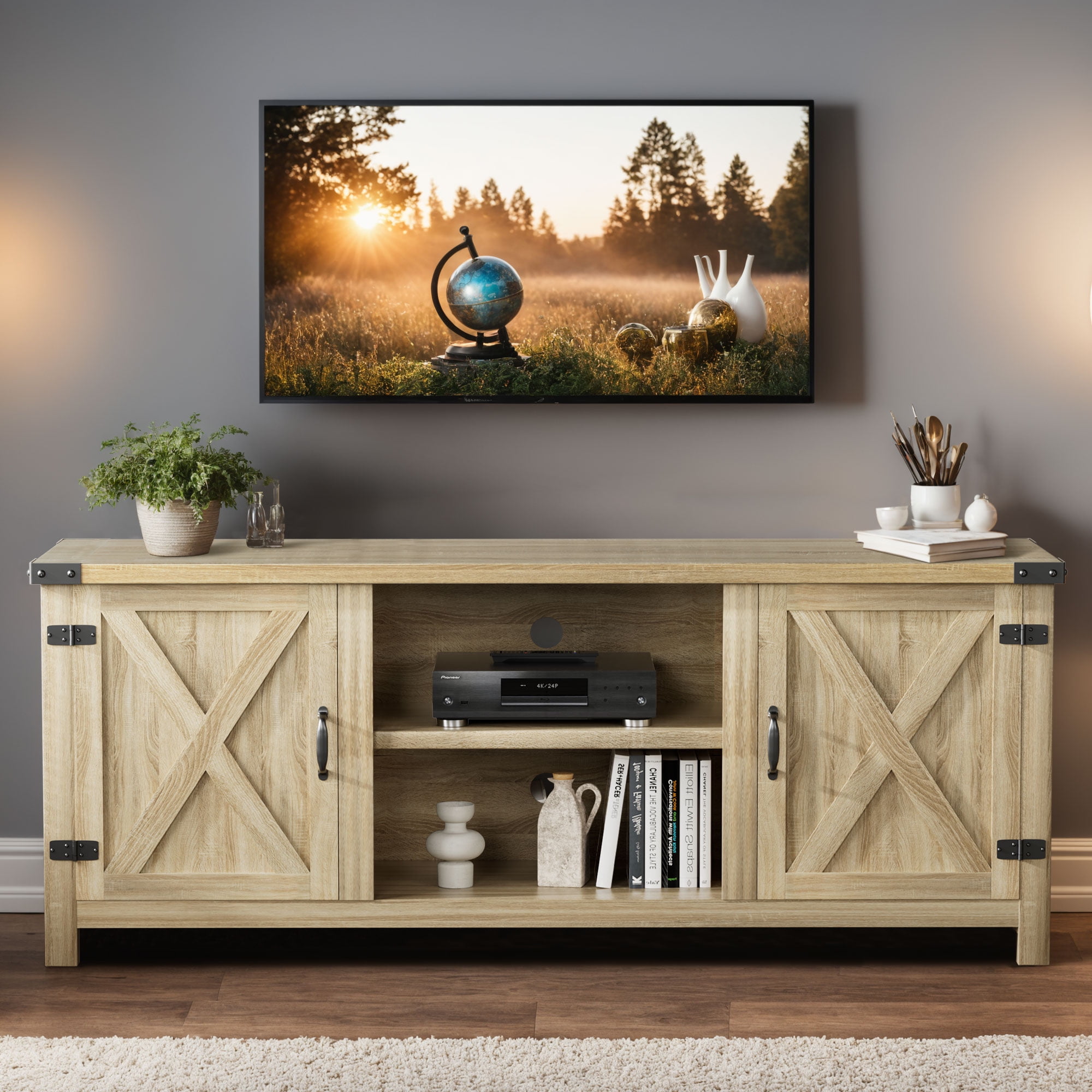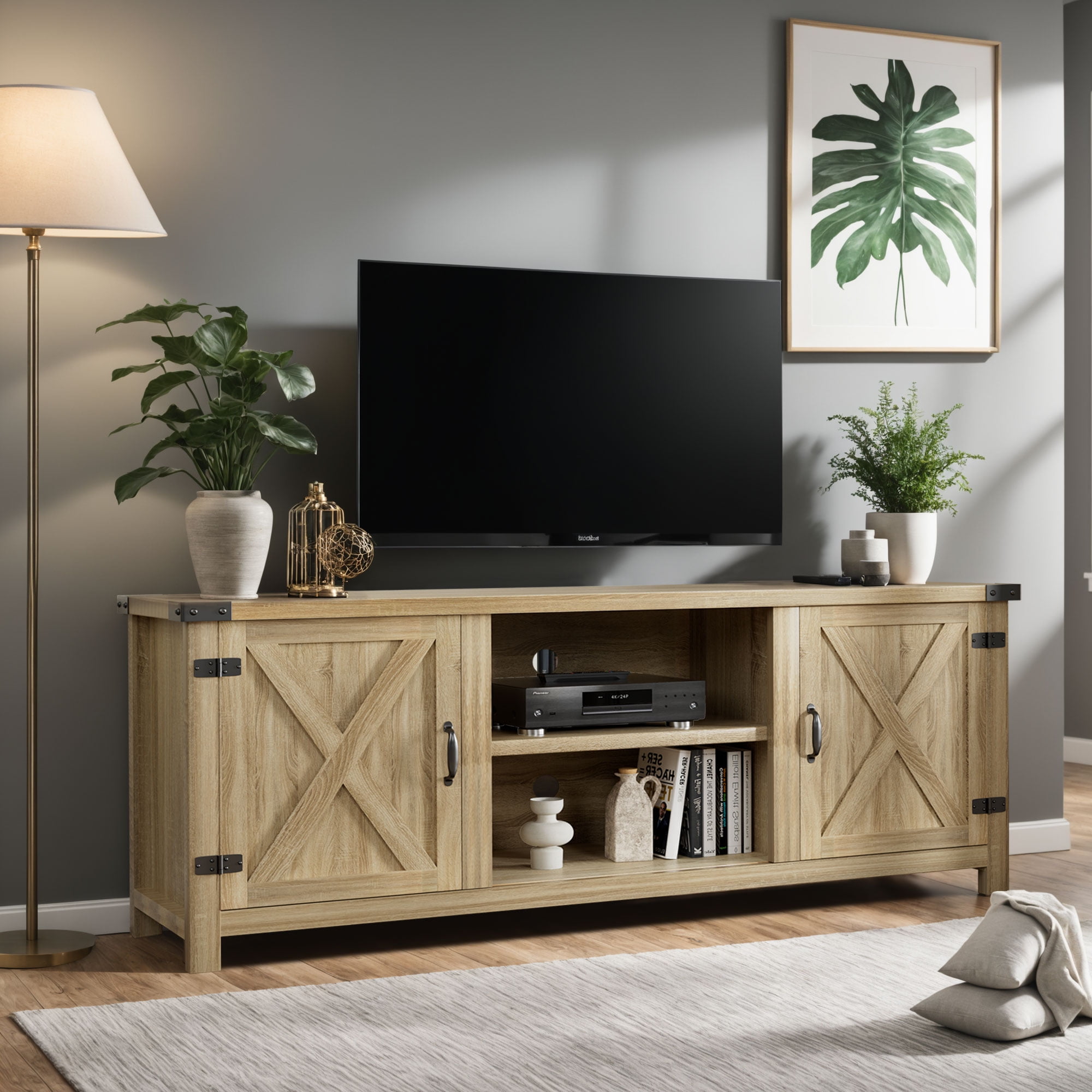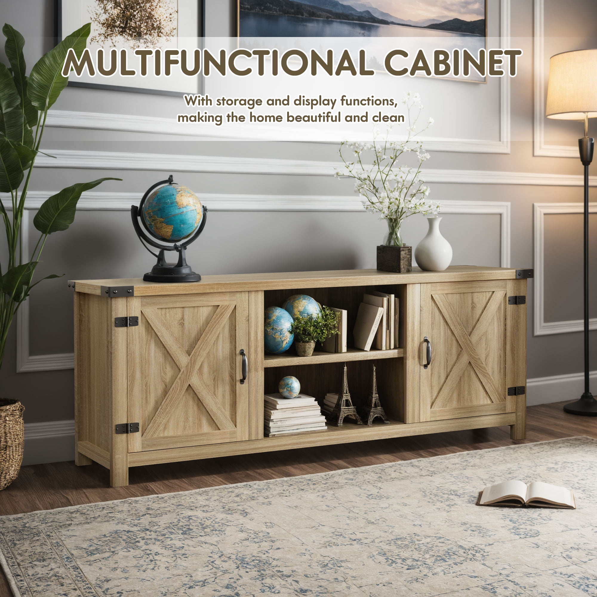 Abundant Storage Space:The Vinego TV stand console comes with 2 large barn door hidden side cabinets with 3 tiers of adjustable shelves, providing plenty of space for your dvds, game boxes, decorative items and more.