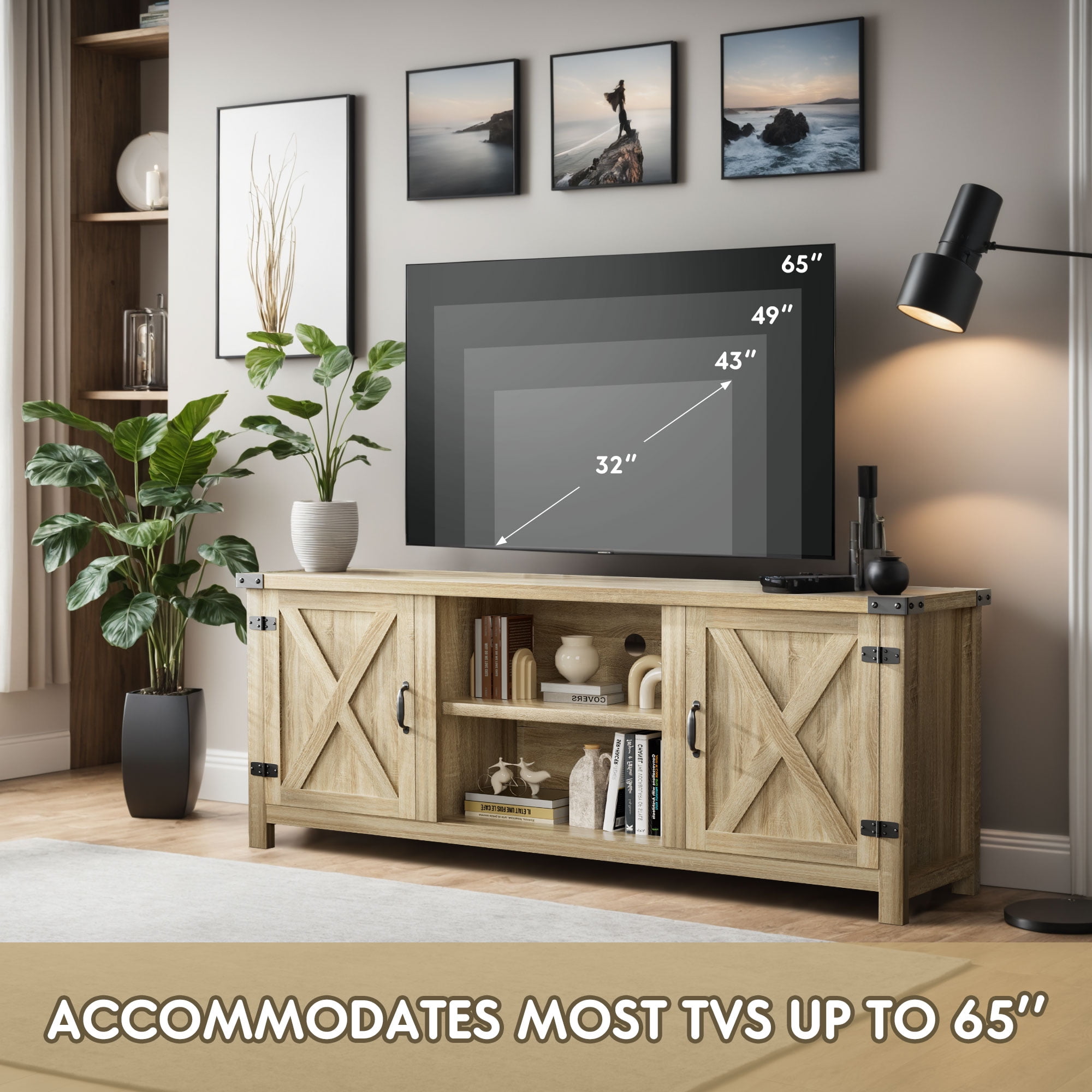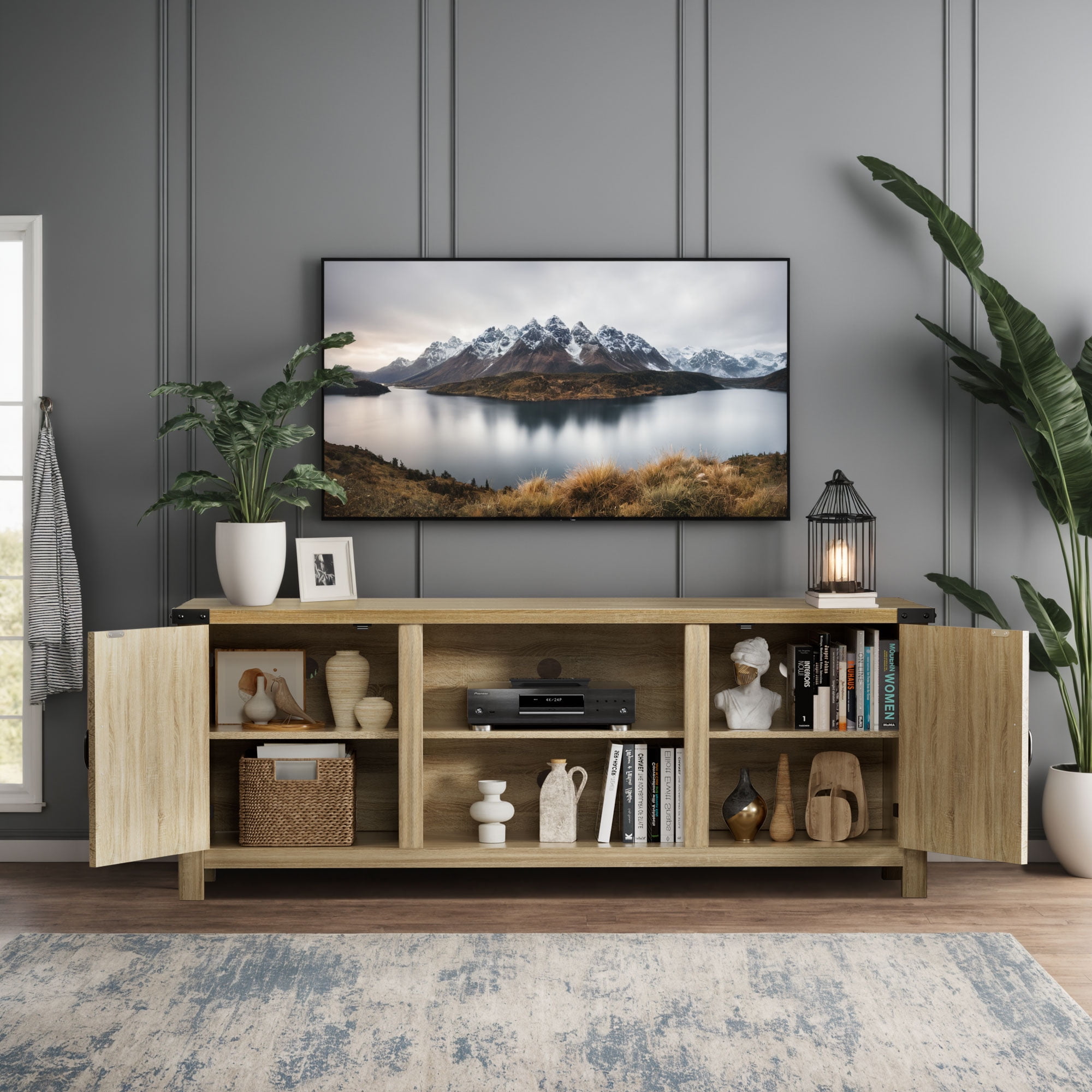 Vineego TV stand elevates your space with a modern farmhouse look and ample storage. The frame is made from engineered wood, with a finish that highlights its natural wood grain (knots and all). This media center has plenty of storage space: It features two cabinets, as well as two open shelves for displaying books and decorative accents. Plus, a cable management cutout keeps pesky wires right where you want them – out of sight. This piece fits TVs up to 65”.