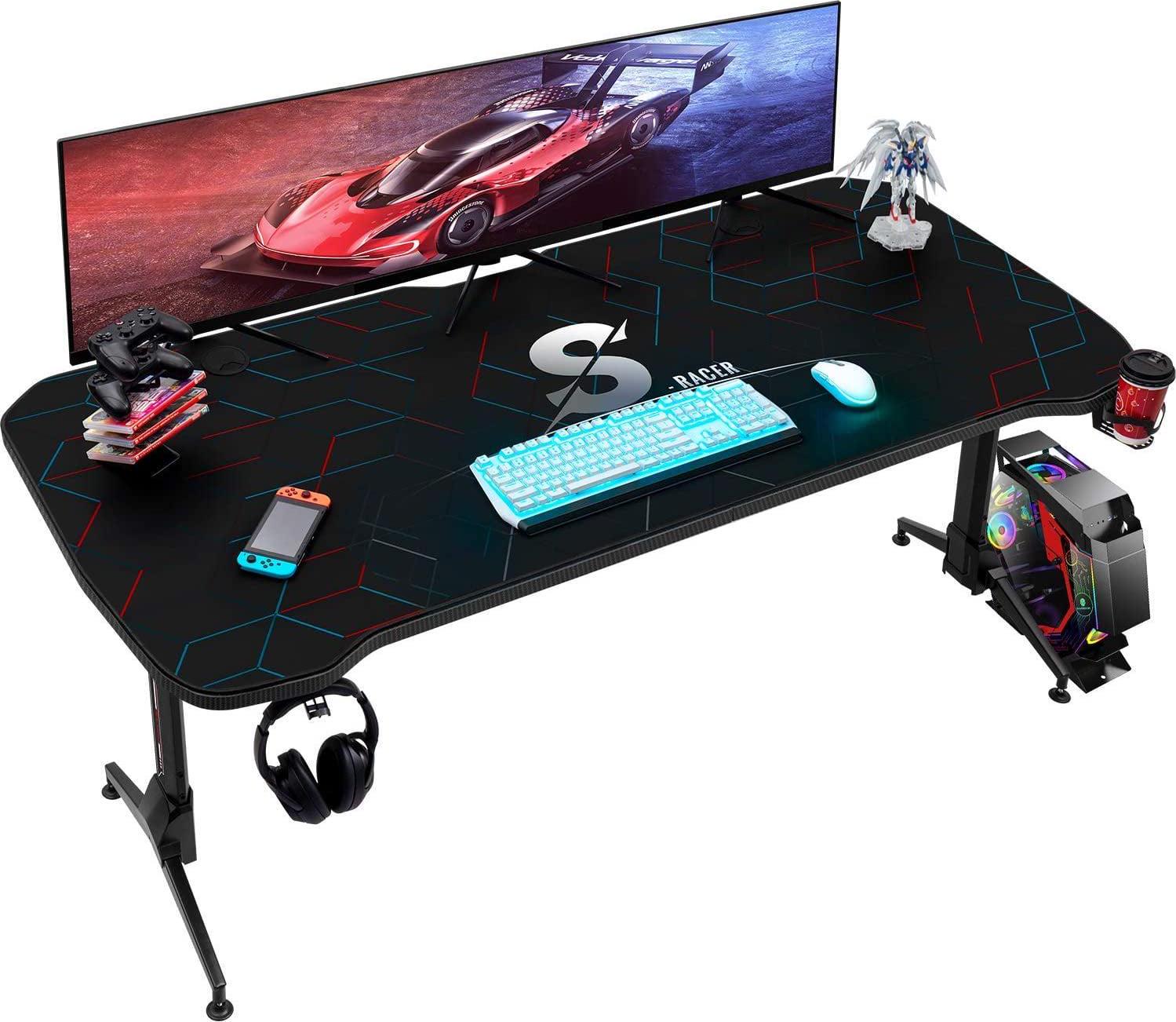 VINEEGO 63 Inches Y-Shaped Legs Adjustable Height Computer Gaming Desk Carbon Fiber Surface Gaming Desk With Cup Holder and Headphone Hook(Black)