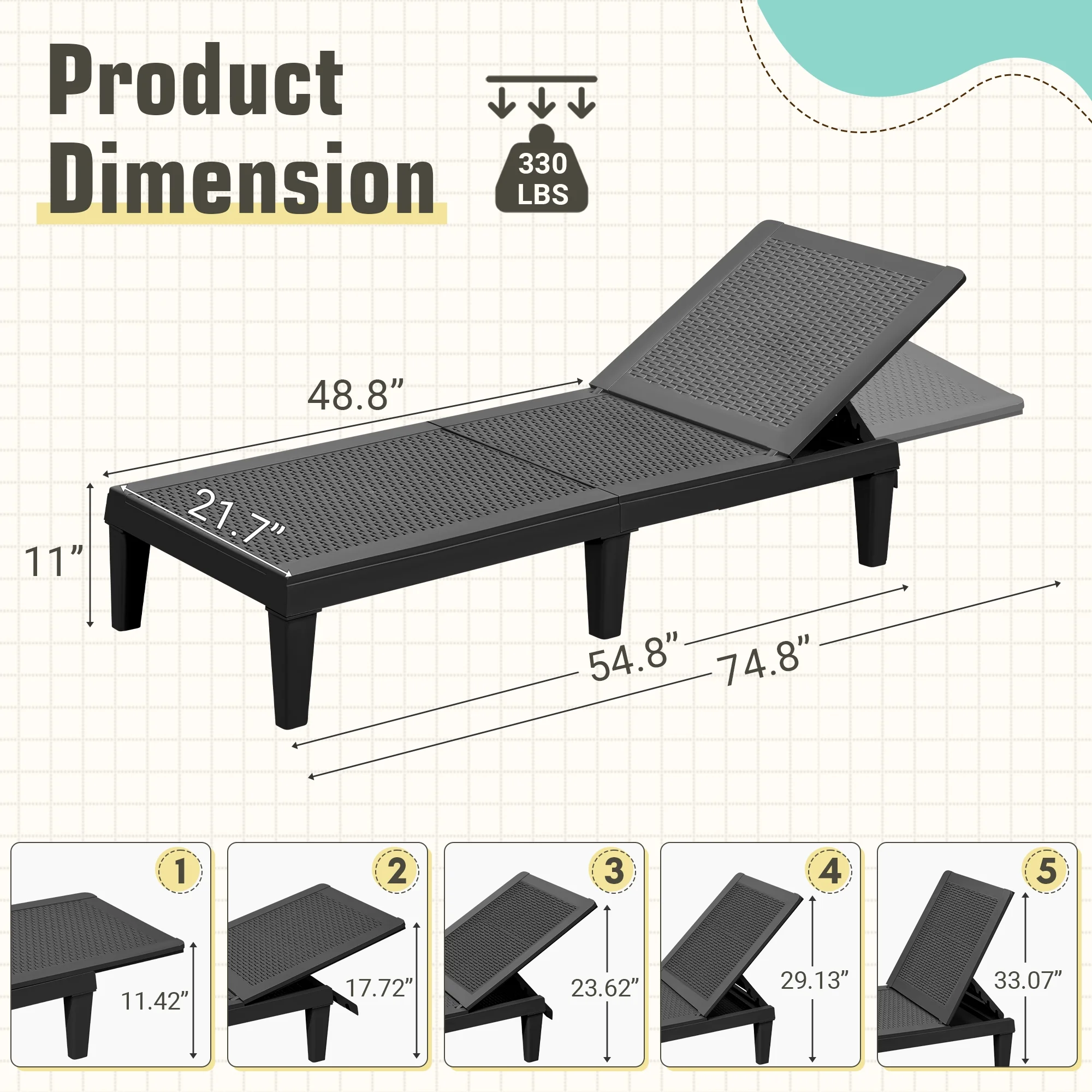 Vineego patio chaise lounges are made of upgraded polypropylene resin, waterproof and UV-resistant, easy to maintain, perfect for outdoor use. 5-Position adjustable backrest allows you to adjust your back to the comfortable position you want to satisfy all of your different needs: Reading a book, napping, sunbathing. Latch mounting design, only 3 steps to install, you can easily take it with you wherever you go.
