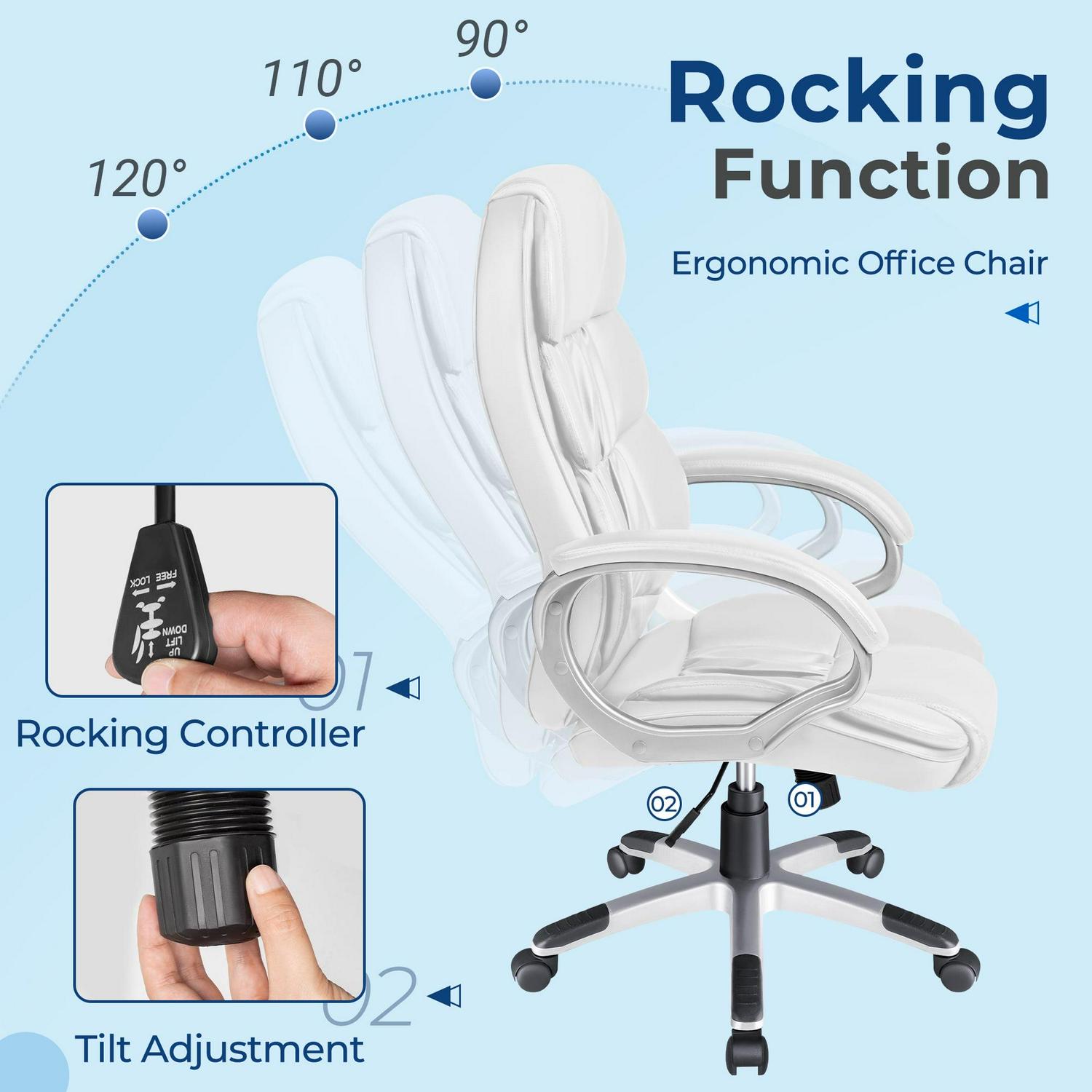 – Ergonomic design: A ergonomic bonded leather lumbar support , a height adjustment pneumatic seat and a comfortable padded curved armrest can relieve your tired feeling and pressure during long workdays.