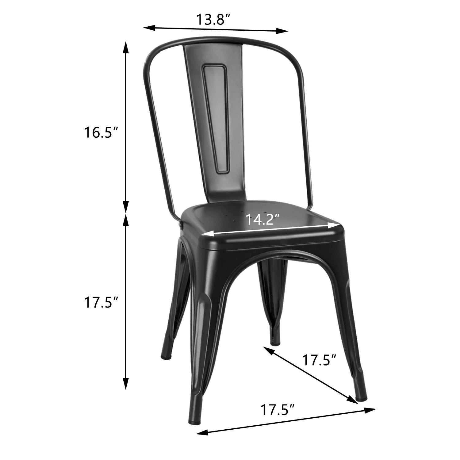 VINEEGO Metal Dining Chair Indoor-Outdoor Use Stackable Classic Trattoria Chair Fashion Dining Metal Side Chairs for Bistro Cafe Restaurant Set of 4 (Black) The chair is made of premium steel which is strong, scratch and mar resistant Cross brace will provide chairs with extra support and stability Sturdy frame of the chair make the chair has a excellent bearing capacity Rubber feet can protect the chair from sliding and keep the floor from scratching Rubber pads on cross brace can protect chairs from scratching when stack them Double varnish painted make chair is waterproof and rustproof Easy to clean due to the paint Saving much space and easy to store through stacking them Easy to assemble It’s a good choice for different occasions such as kitchen, cafe, cafe, bistro, etc You can use it to enjoy delicious food in restaurant A year after sale service