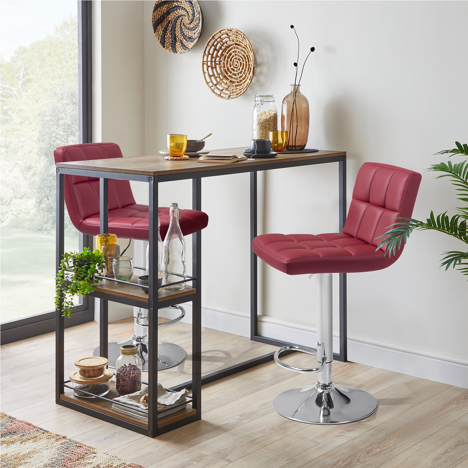 Adjustable Design:Our bar features a 360° swivel seat, making it easy to grab something or chat with others without having to stand up, turn around or move around frequently. The chair height can be adjusted from 33.05-44.01 inches to meet different needs. Modern style and padded bar stool bring you comfortable and enjoyable usage experience Easy to install and touch: with detailed instruction installed the stools less than 20 mins. Specifications: 360 degree rotation Material: Premium PU leather and metal Seat size: 16″(L) x 15.4″(W) Height adjustment range: 33.5″-44.01″ Rubber ring at the bottom to prevent scratching the floor Quadrangular cushion, filled with high-density three-dimensional foam Pneumatic adjustable height, easy and safe to adjust Base and footrest, made of chrome-plated steel, durable and stable