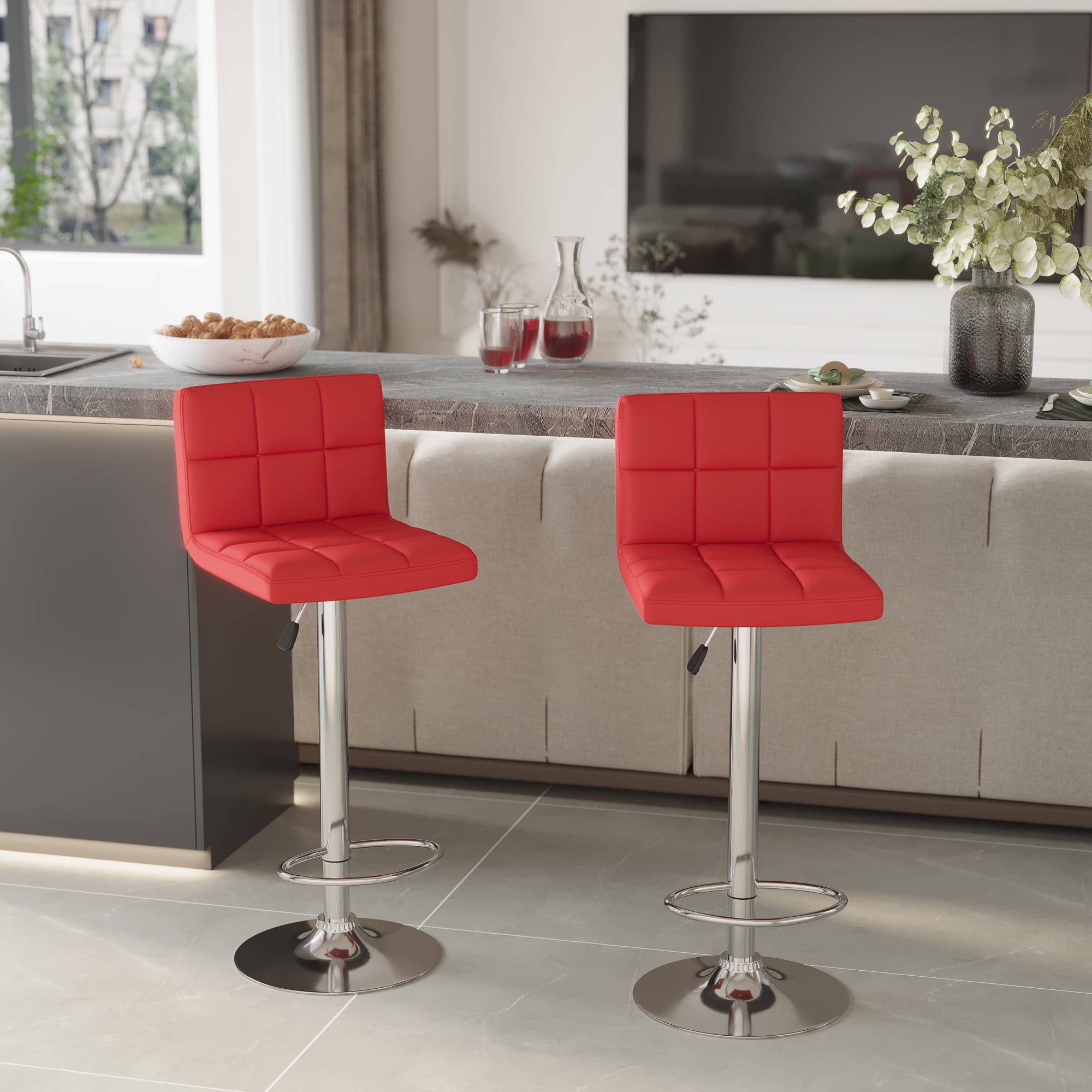 Vineego Modern Square PU Leather Swivel Adjustable Bar Stool, Set of 2, Bar Stool for Kitchen Counter,Red