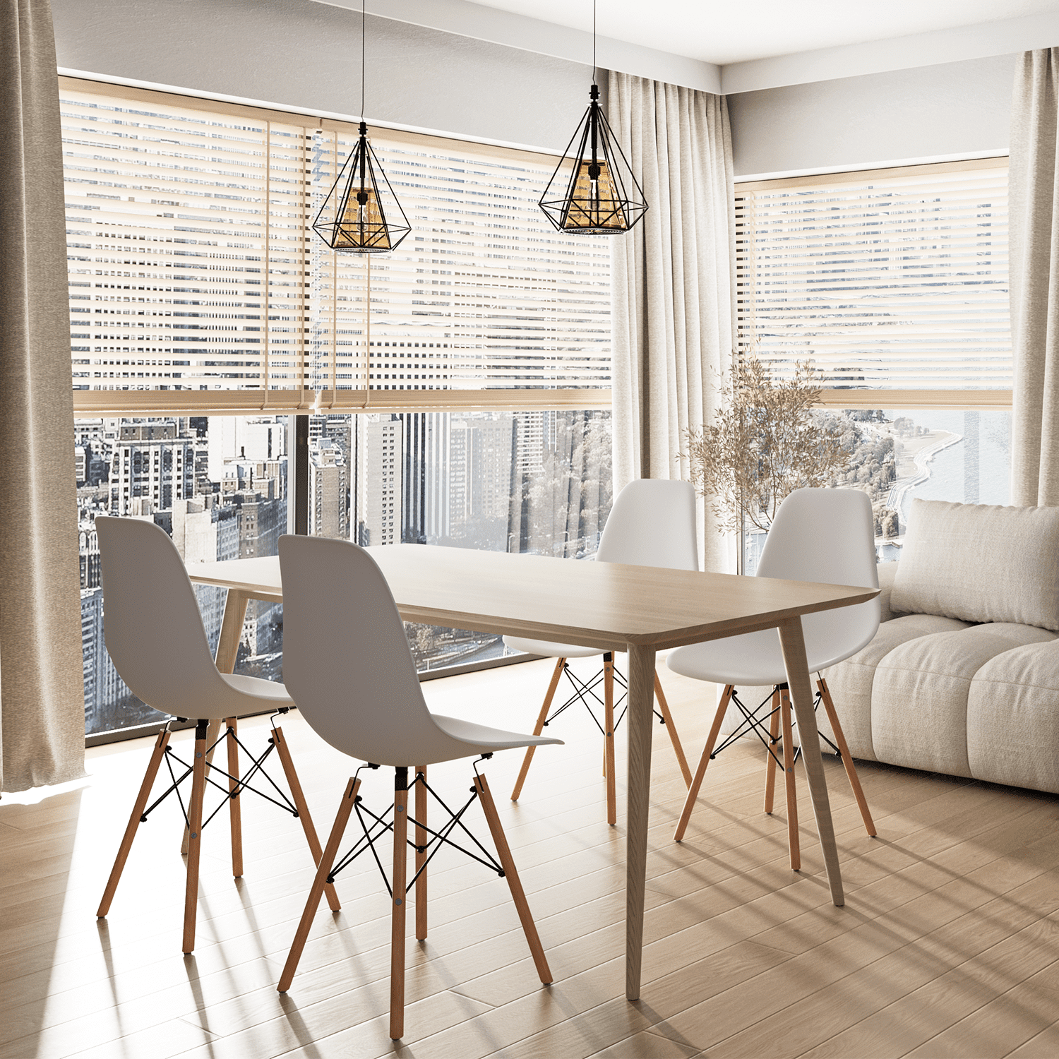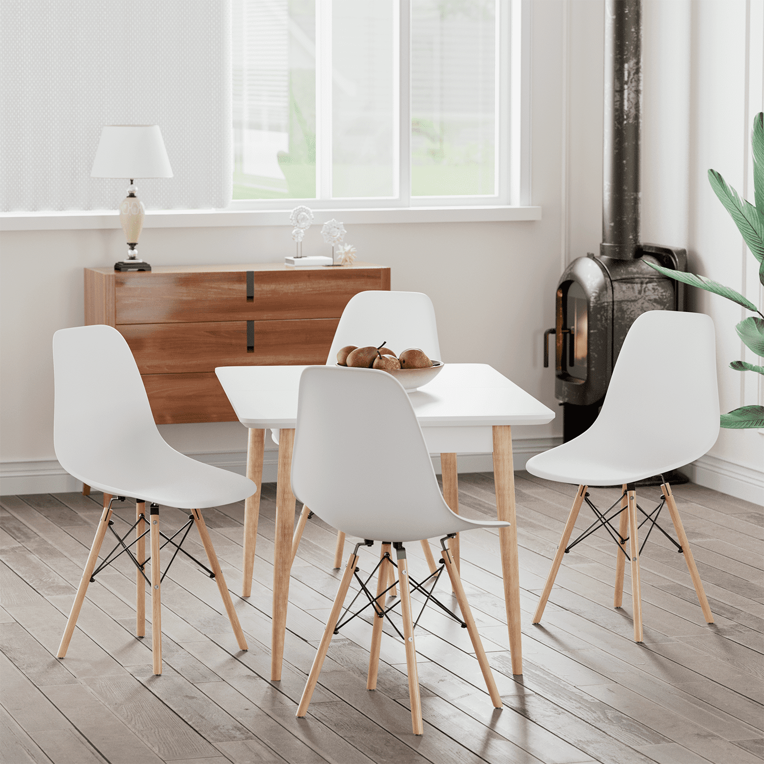 Decorate your dining room in an atmospheric, contemporary style with this 4-piece dining set with a streamlined profile that sits on four solid wood legs and unfolds for a mid-century modern look. We love their sturdy backrest and Eiffel-style support frame, which not only add stability but also add a fresh, romantic feel to your kitchen or dining area. Best of all, these chairs are rust, scratch, stain and water resistant. Their high-gloss finish means they can be easily wiped up when spills and messes occur. The black cover shown on the thigh is shipping material and not part of the design.