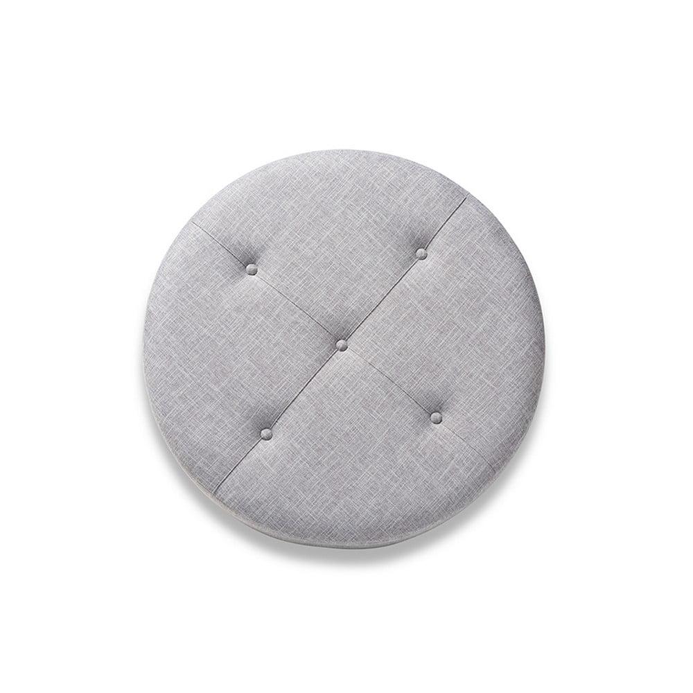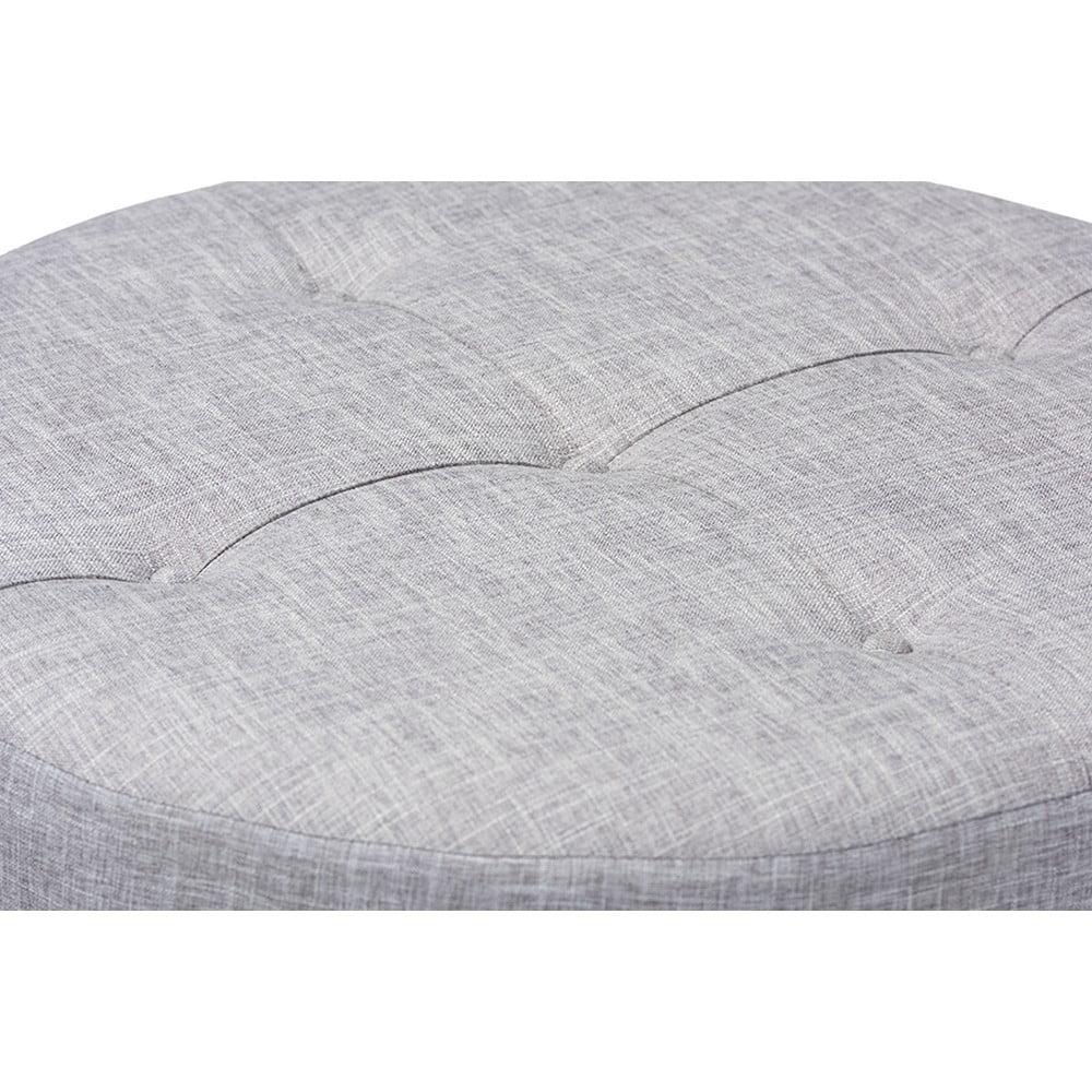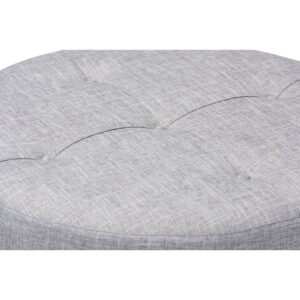 Vinet Modern and Contemporary Light Gray Fabric Upholstered Natural Wood Cocktail Ottoman Chic and versatile, the Vinet ottoman is designed for the modern home. Constructed from MDF wood, the Vinet is upholstered in a soft polyester fabric that displays a subtle crosshatch weave for a natural, earthy feel. The neutral upholstery is complemented by sturdy fir wood legs, which showcase the rustic beauty of the woodgrains. Button tufting on the top and brass nailhead trim along the lower edge add a touch of elegance. Use this versatile piece as a coffee table, footstool, or as extra seating for guests. The Vinet ottoman is made in China and requires assembly.