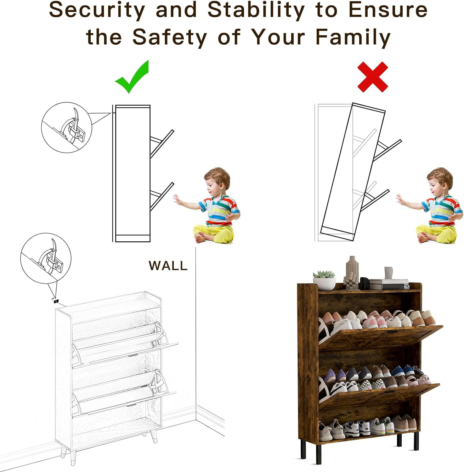 [Large Capacity Shoe Cabinet] The shoe cabinet with doors has been upgraded to dimensions of W32.68*D9.45*H45.24in, this 3-tier shoe cabinet offers ample storage space for your shoes, equipped with two flip drawers, a top shelf, and an extra shoe cubby. There is a fence on the top, ideal for placing potted plants, ornaments, socks and keys, without worrying about falling. This shoe cabinet can hold up to 24-32 pairs of shoes. [Farmhouse Entryway Shoe Cabinet] The entryway shoe cabinet features rustic and charming lines on its surface, coupled with black metal handles, lends the cabinet a timeless and homely look. This shoe cabinet is not just functional but also aesthetically pleasing. Its simple yet stylish design complements various home decor styles. Perfect for entryways, hallways, living rooms, or porches to give your home a neat and space-saving look. [Superior Build for Durability] This wooden freestanding shoes organizer rack, constructed from premium MDF and Engineered Wood, guarantees stability and impressive strength with a max load capacity of 200 lbs. Boasting a resilient build that resists wear, deformation, and moisture, it’s designed for lasting durability. [Flip Drawers for Space Saving] Our stunning Hidden Shoe Cabinet, ingeniously designed with flip-up drawers that maximize your space efficiency. Each drawer boasts a versatile center panel that’s fully adjustable or removable to expertly fit a variety of footwear. Our thoughtful design caters to larger shoe sizes, comfortably accommodating up to US Men’s 13 or Women’s 12. Elevate your entryway while effortlessly organizing even your most extensive shoe collection! [Safety] An integrated anti-tip feature offers enhanced safety by enabling secure wall-mounting to prevent unexpected falls, safeguarding your family. Maintaining its pristine condition is effortless with its waterproof surface and easy-to-clean design. [Easy to Assemble, Clear Instruction] Your satisfaction is our top priority. If you have any after-sale problems, please feel free to contact us! Introducing our Slim Shoe Cabinet featuring a Full Dust-Proof Panel Design. Unlike conventional shoe racks, this narrow shoe cabinet safeguards your footwear from accumulating dust at the base. Inside each package, you’ll find all essential parts along with clear, easy-to-follow assembly instructions. Parts are thoughtfully labeled, holes pre-drilled for hassle-free setup, making it a breeze to put together this shoe storage solution in no time.