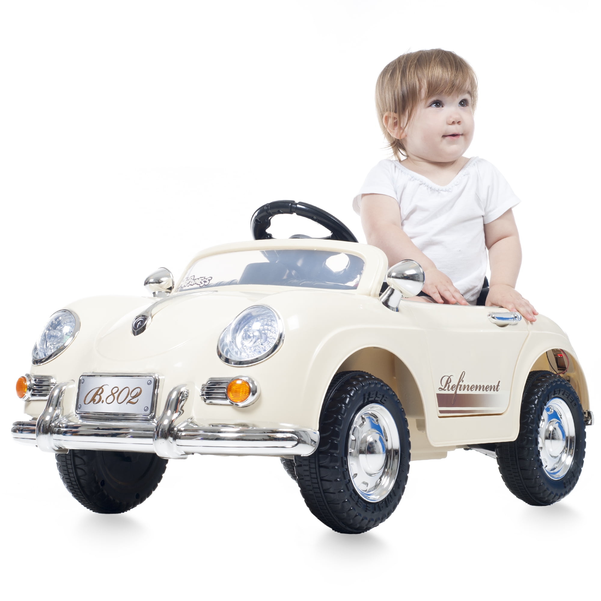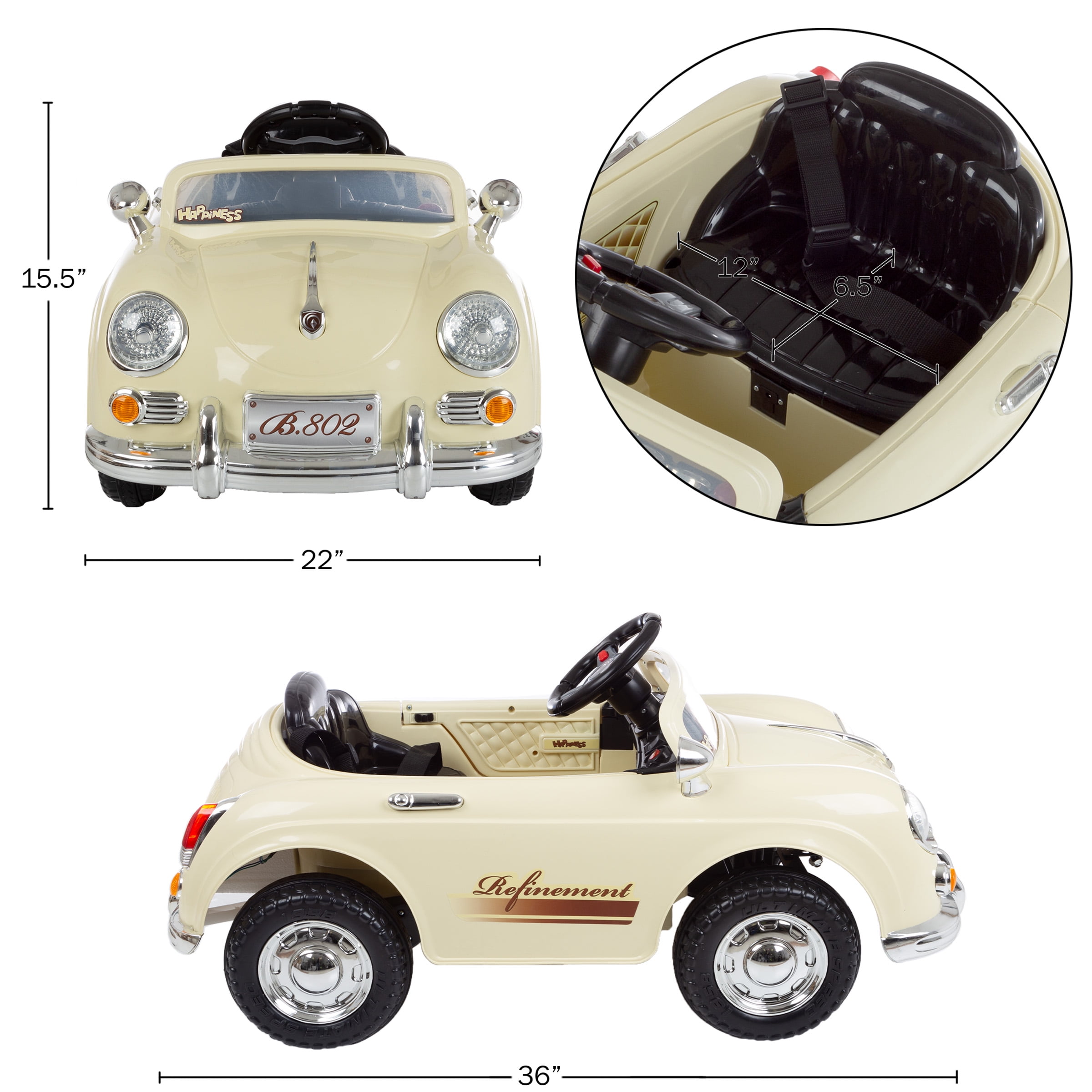 KIDS ELECTRIC CAR – This classic kids’ car is smooth and simple to ride for children aged 3 to 6. Charge the included 6V battery according to the provided ride on car instruction manual, turn it on, and your child can press the pedal and start driving. REALISTIC FEATURES – The 6-volt electric car has both forward and reverse functions, high and low gears, headlights, a driver’s door that opens, an auxiliary port to play MP3s, a horn, sound effects, and cruises at a safe speed between 2-3 miles per hour. PARENTAL REMOTE CONTROL – This electric car for kids allows parents to fully operate the toy car by remote control or assist their child as they learn to drive. Perfect for outdoor and indoor playing, this car can be used on any hard, flat surface. SAFE AND DURABLE – Made from rugged high-quality plastics with chrome trim, this ride on car with remote control is great for boys or girls. The Lil’ Rider cars for kids are free of banned phthalates and provide healthy exercise and plenty of fun. PRODUCT DETAILS – Materials: Plastic. Dimensions: (L) 36″ x (W) 22″ x (H) 15.5″. Specs: 15W, 6V 4.5ah Rechargeable Battery. Output: DC12V 500mA. Speed: 2 to 3mph. Requires 2AA Batteries. Assembly Required. Use Under Adult Supervision. Color: Cream.