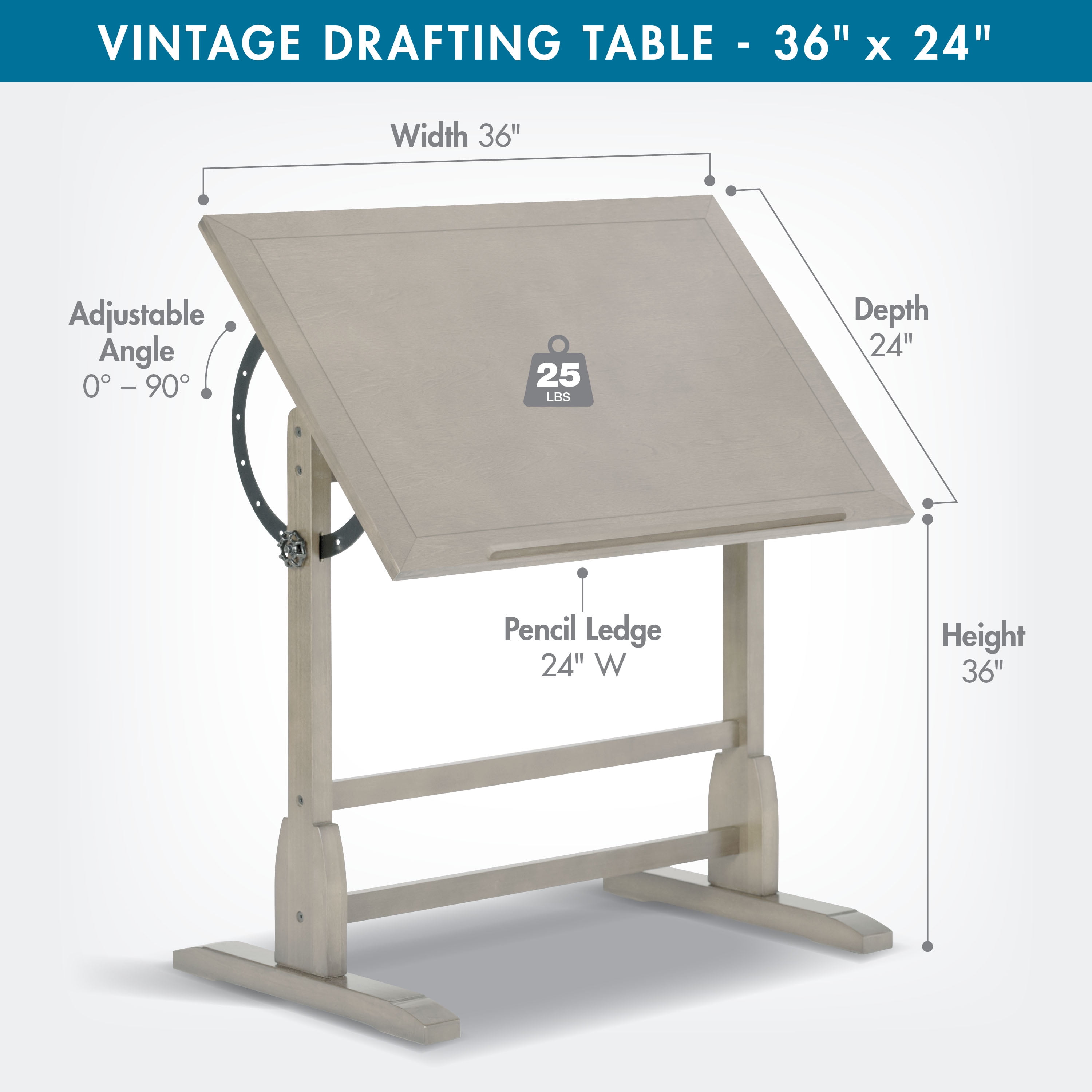 Overall Dimensions: 36″W X 24″D X 36″H ADJUSTABLE DRAFTING DESK: Large surface adjustable desk with sturdy solid wood construction table top for artists and designers to work comfortably at all angles for long periods of time EASY ACCESS TO ART SUPPLIES: pencil groove with 24″ long ledge holds pencils, pens, and other art supplies and materials PRECISION DRAWING DESK: Floor levelers stabilize on uneven floors and prevent scratching TILTING TOP ADJUSTABLE TABLE: Vintage drafting table solid wood top with 24″ wide pencil ledge adjusts to 0, 23, 46, 70, and 90 degrees; Weight limit 25 lbs ART AND DRAWING TABLE: Includes one drafting table with a solid wood table top, polar veneer base, and antique style metal hardware; Ready to assemble for easy shipping; Overall dimensions are 36″ W x 24″ D x 36″ H
