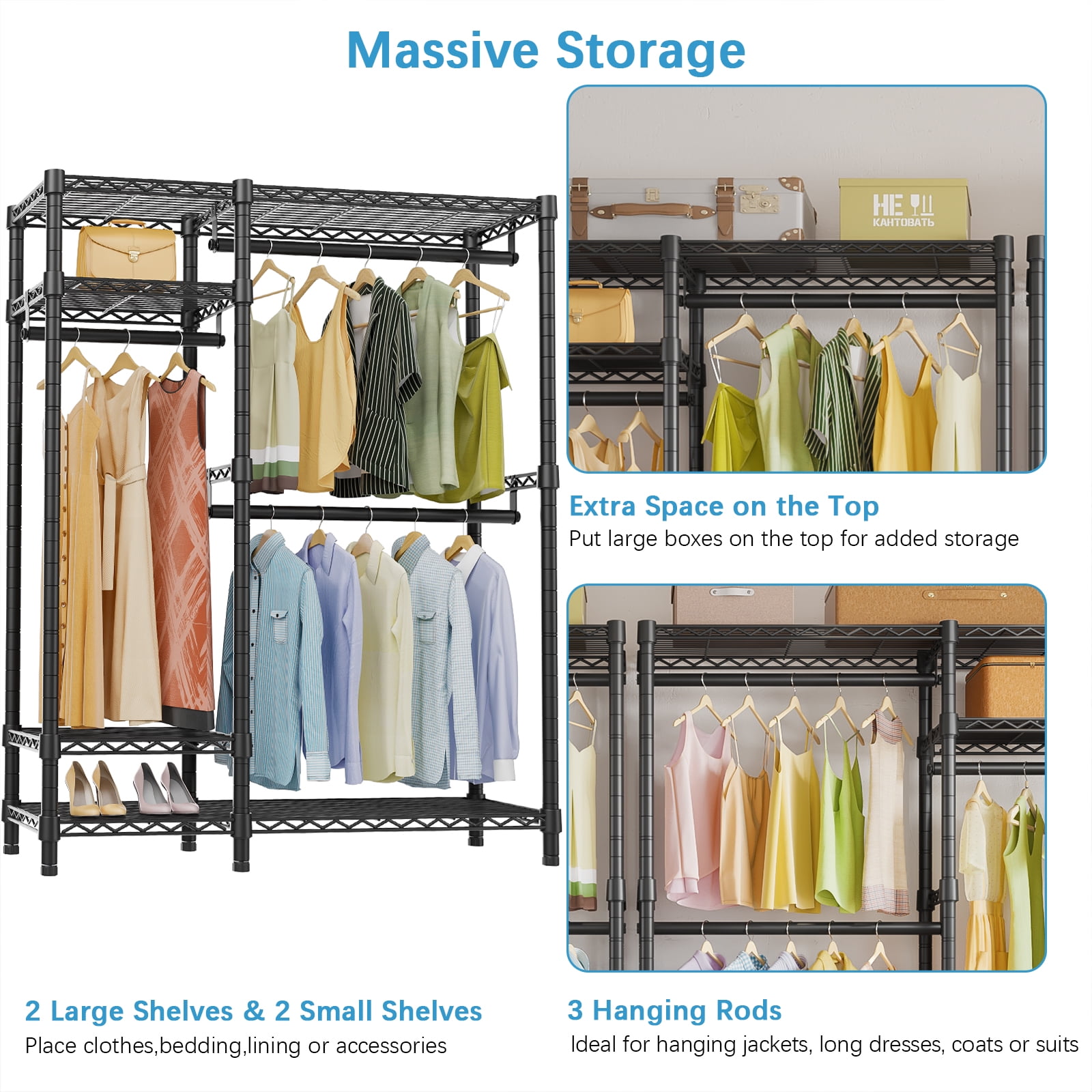 Sturdy & Durable: Clothing Racks with 3 Hanging Rod Freestanding Closet Metal Storage Rack Wardrobe Closet was made of high-quality iron, it features stable, sturdy, and durable. Easy access in the bedroom, cloakroom, clothing store, laundry room, walk-in closet, and more.