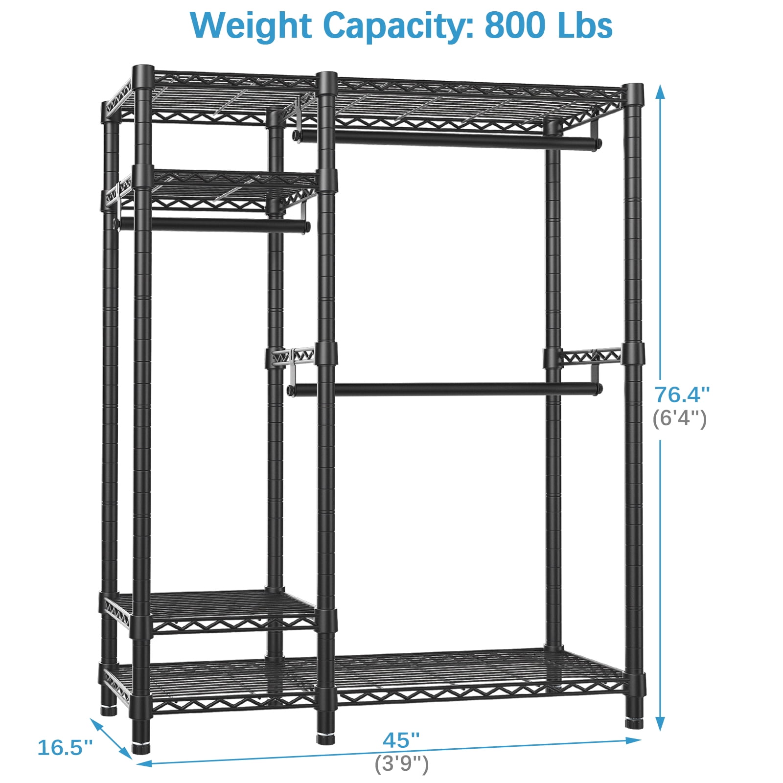 Multifunction: 2pcs small shelves and 2pcs large shelves ensure you enough space to place your clothes,accessories, bedding, lining, shoes, etc. The 3pcs hanging rod holds up to 33 lbs for each, it is great for hanging suits, coats, long dresses, jackets, pants, shirts, or other heavy clothes. Dimensions & Weight: 45” L x 16.5” W x 76.4” H; 38.58LBS. Strong bearing capacity: load capacity up to 800LBS, not easily deformed. It can create extra storage space instantly, and instantly organize your messy items into neat condition with little effort. Specification: Top Shelf Storage Space: It is a good place to store suitcases that you don’t normally use. Reticulated shelves, make the rack more simple and generous, better load-bearing. Flexible Combination Space: Tired of folding clothes? You can hang all your jackets, coat, and skirts neatly for easy selection. No longer going out in wrinkled clothes. Bottom Collection Space: A catch-all for heels, boots, and other articles formerly tossed to the floor. Say goodbye to messy floors. Specifications: 1. Total load capacity: 800 lbs 2. Sturdy and durable steel construction 3. Multifunction heavy-duty clothes rack with different tier options. 4. Freestanding closet system provides generous space, ideal for bedroom, laundry room, clothing shop and more. 5. Easy to assemble, no tools needed. Product Details: Material: Steel Color: Black Item Dimensions: 45″ L x 16.5″ W x 76.4 ” H Package includes: 1x VIPEK V2S Garment Rack illustrated Installation Manual Installation Hardware and Tool