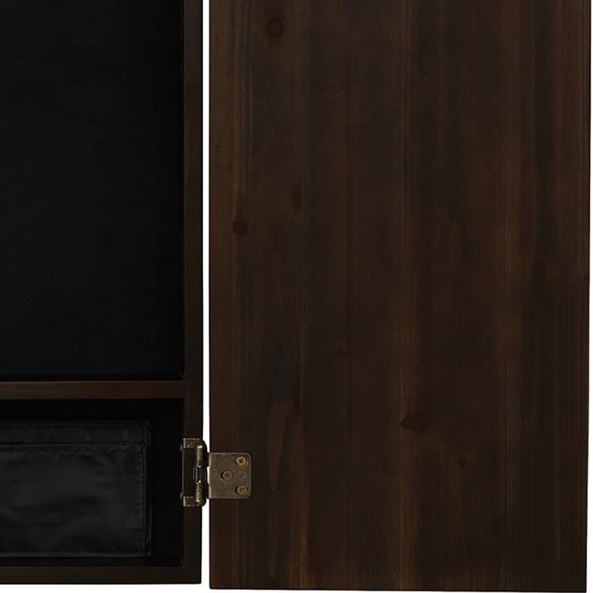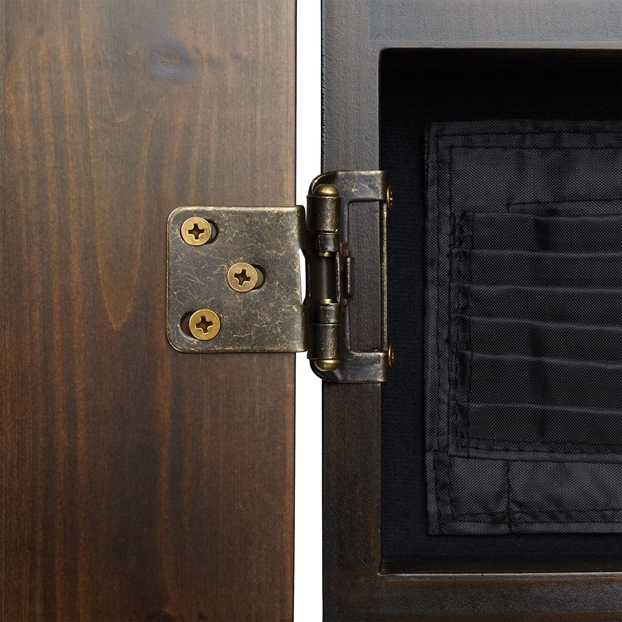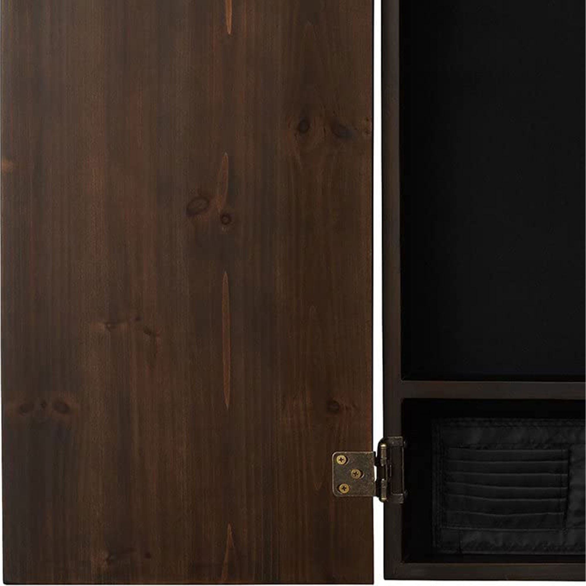 Metropolitan dartboard cabinet protects your walls and gives you a classic place to store your dartboard (not included) Built-in storage compartment holds extra flights and darts when not in use Soft black cloth lining at the back of the cabinet protects your walls from stray darts Self-closing cabinet doors keep your dartboard hidden after the game Comes with mounting hardware for easy installation in your game room or living space Can be used with most electronic soft tip dartboards Material: Pinewood Color: Espresso Interior dimensions (L x W): 37.25 x 24 inches Closed dimensions (L x W x H): 38.5 x 25.25 x 3.5 inches Open dimensions (L x W x H): 38.5 x 49.5 x 3.5 inches Weight: 20 pounds Manufacturer warranty: 60-day warranty