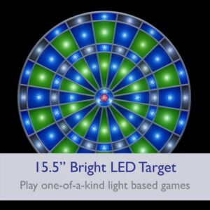 – Modern wall-mounted dartboard featuring an LED-illuminated scoreboard surface