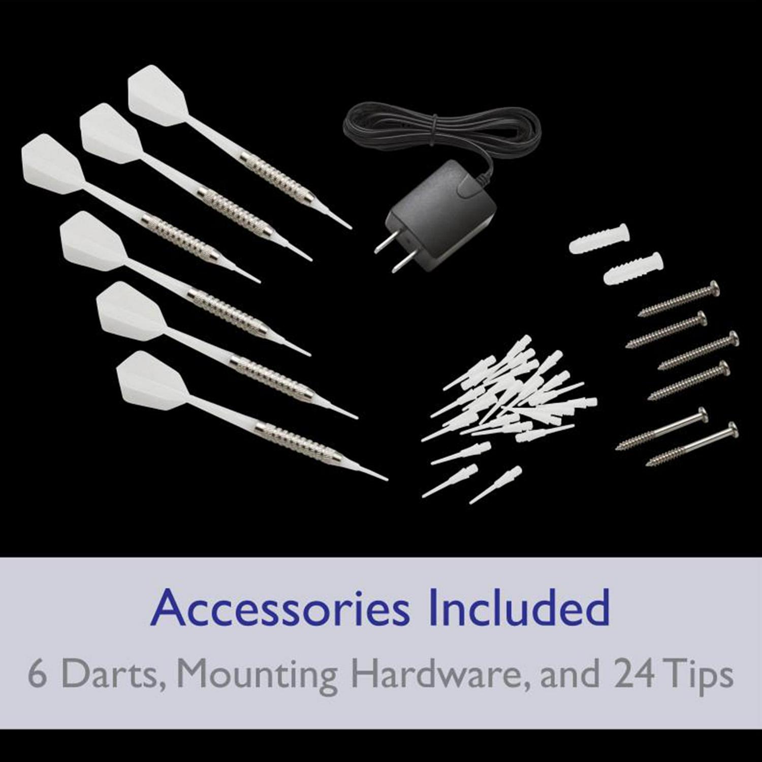 - Includes 6 soft tip darts, mounting hardware, 6 spare tips, and instruction manual