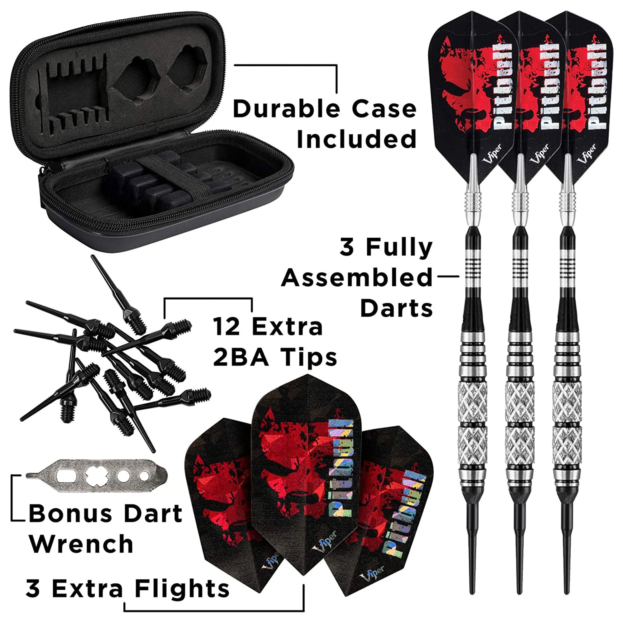 Bring a primal ferocity to your dart game with the Viper Pitbull Soft Tip Darts, designed for use with either electronic dart boards or most sisal dartboards. These darts feature a barrel fashioned from 90-percent Tungsten and 10-percent Nickel. Using tungsten to create slimmer darts, allows for tighter shot groupings without sacrificing control, thus increasing your scores. Each barrel enjoys knurled bands, deep grooves, and hand-painted rings, allowing your grip to remain consistent throw after throw. The Pitbull Darts feature tough, lightweight Aluminum Spinster Shafts that can rotate freely, allowing them to help reduce bounce-outs. These shafts feature locking holes that allow a more secure fit to your barrel; you won’t find yourself retightening these shafts after a shot or two. Each set includes 6 high-speed slim flights, 12 extra 2BA Tufflex III Tips, a dart mechanic repair tool, and a TacTech EVA dart case. Featuring a hard outer shell and foam-lined slots to keep your dart secure, this case has room for everything included in this set! Finally, each Viper Pitbull Soft Tip Darts is finished off with a savage Pitbull adorning each slim flight, for a fierce look.