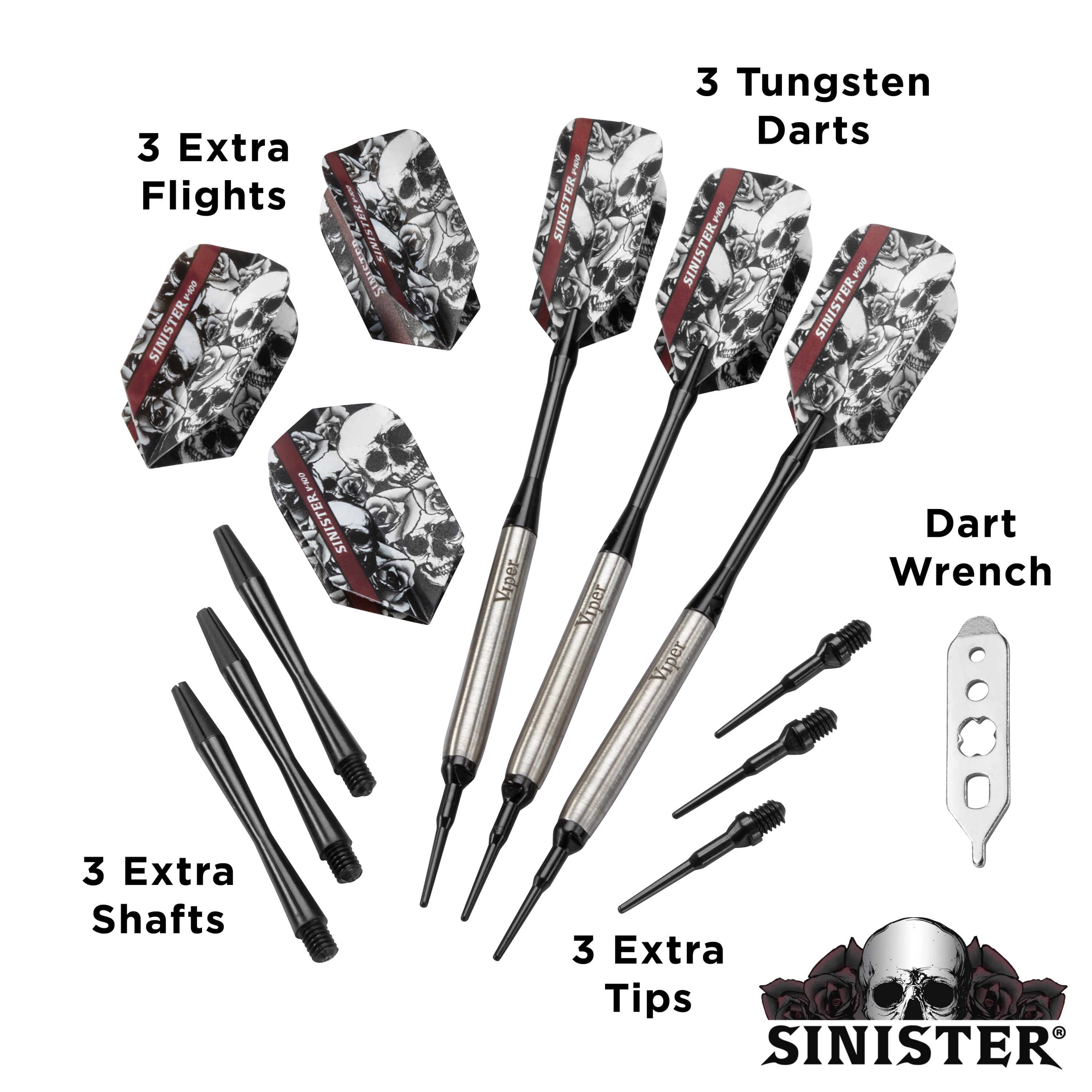 Elevate your game with Viper Sinister soft tip darts, designed for use with electronic dartboards. The barrels of these darts are 95% tungsten, a durable metal that makes the world’s best darts. This is because tungsten’s high density allows the darts to be made slimmer, which allows for tighter groupings and higher scores. Each barrel’s smooth grip ensures an easy release for more accurate throws. The aluminum dart shafts are stronger than nylon or plastic and feature locking holes to help keep them secure. To top it off, each one is adorned with an exclusive Sinister high speed dart flight, perfect for straight, fast throws. Each set includes three fully assembled soft tip darts, three extra nylon shafts, three extra tips, three extra flights, and a dart wrench.