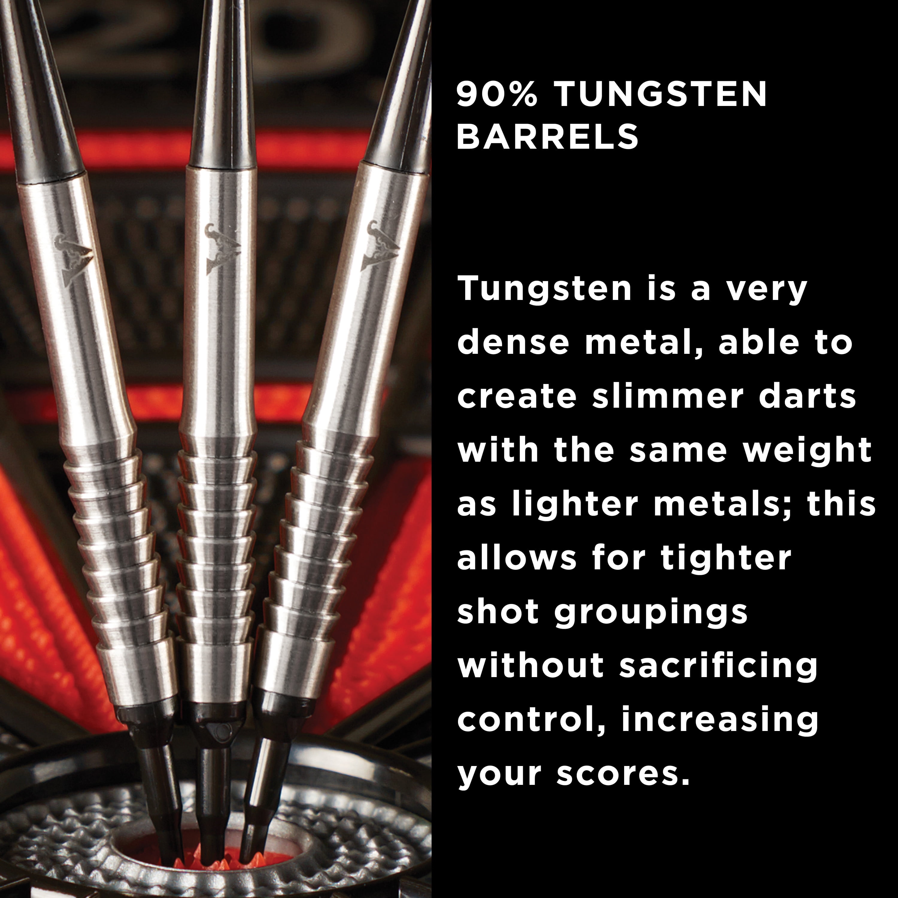 90% Tungsten Barrels have a slim profile, allowing for tighter grouping of shots which increase scoring. Knurled barrel with shark fin grooves provides an excellent and consistent grip throw after throw. Heavy duty 150 micron flights are among the hardiest flights in the industry, standing up to punishing throws. Keep darts and accessories protected with a Deluxe Dart Pal dart case, featuring a hard outer shell and a soft cloth lining. Includes six flights, three extra nylon replacement shafts, nine 2BA Tufflex II Tips, a dart mechanic repair tool, and a Deluxe Dart Pal Dart Case.