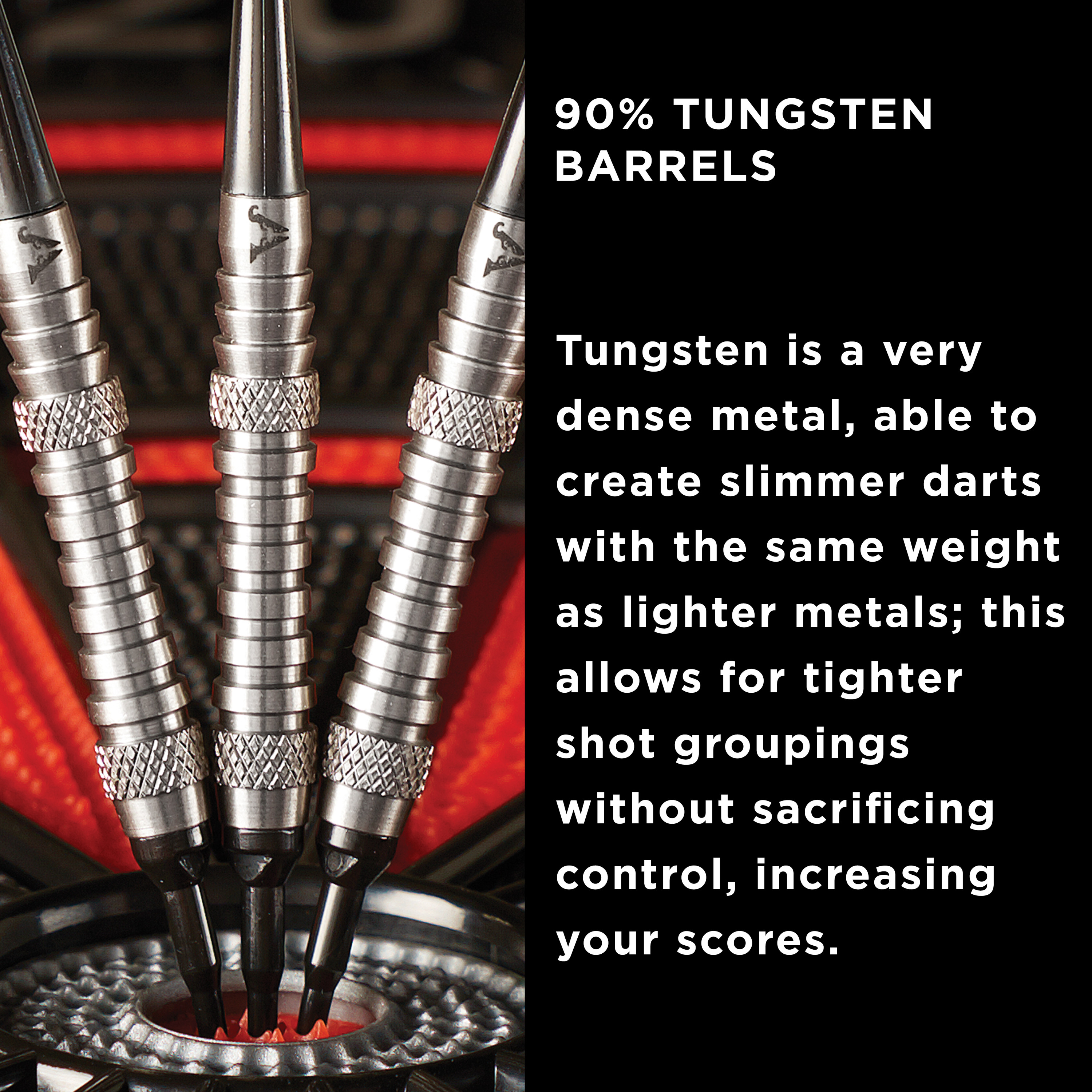 90% Tungsten Barrels have a slim profile, allowing for tighter grouping of shots which increase scoring. Knurled barrel with shark fin grooves provides an excellent and consistent grip throw after throw. Heavy duty 150 micron flights are among the hardiest flights in the industry, standing up to punishing throws. Keep darts and accessories protected with a Deluxe Dart Pal dart case, featuring a hard outer shell and a soft cloth lining. Includes six flights, three extra nylon replacement shafts, nine 2BA Tufflex II Tips, a dart mechanic repair tool, and a Deluxe Dart Pal Dart Case.