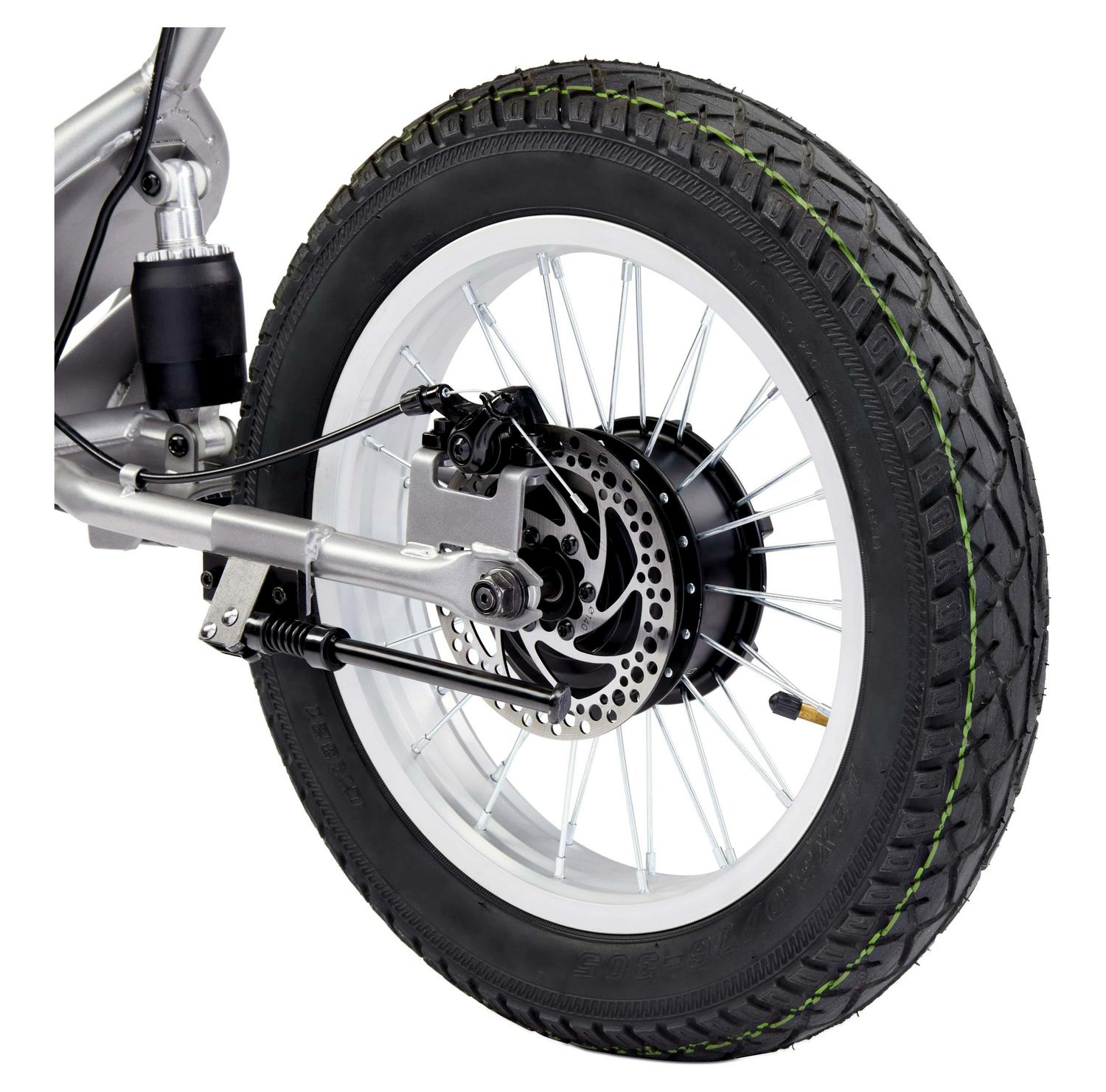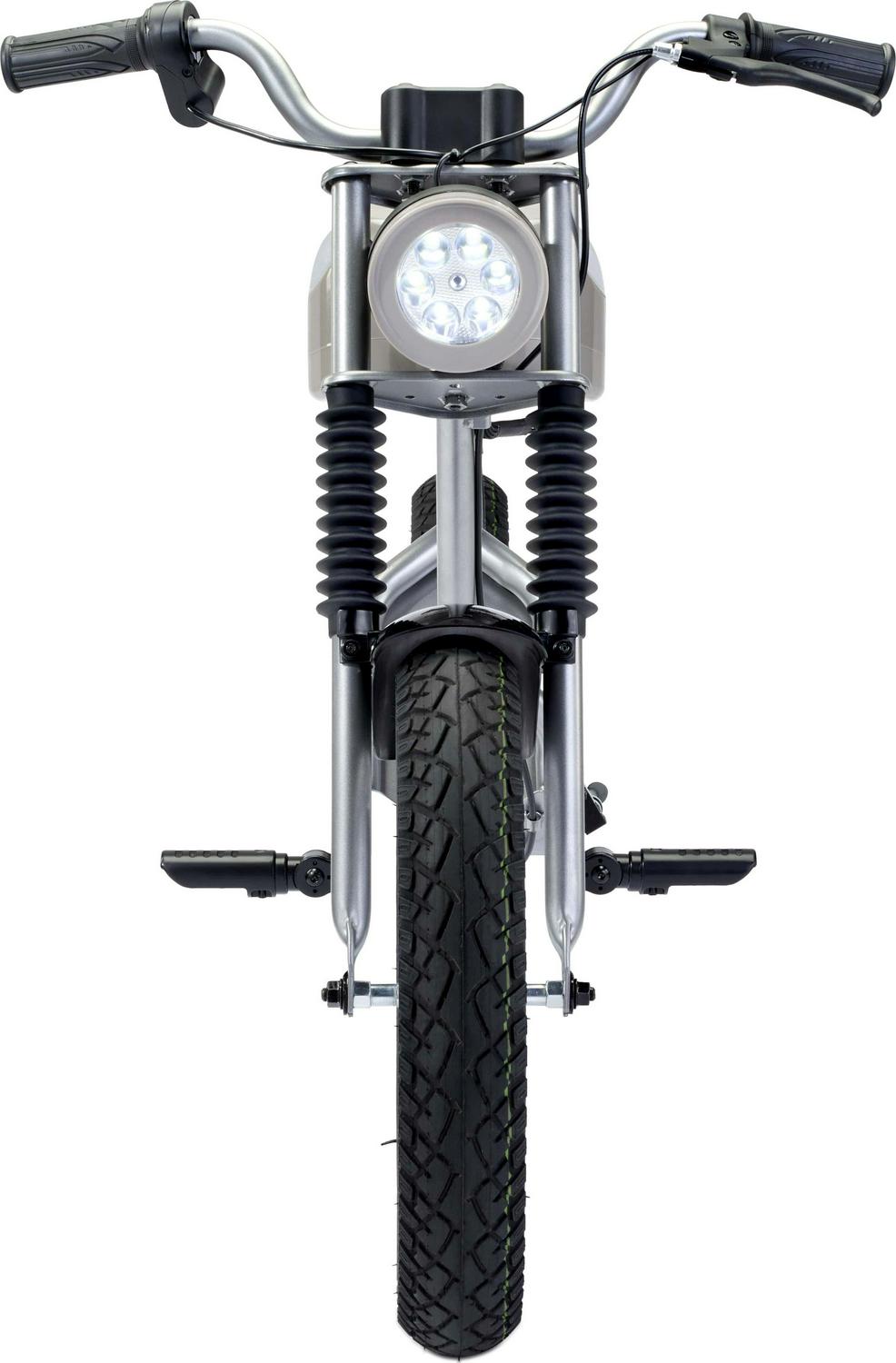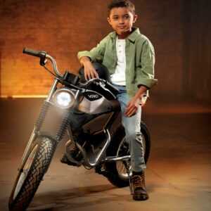 The VIRO Rides Cafe Racer is a sleek electric minibike that can reach speeds up to 15 MPH, with a 7.4 -mile range. The parent-control features allow adults to limit the speed to 10 MPH for younger or less experienced riders. The dashboard has speed and power displays, so you know how fast you are going and when it’s time for a recharge. Working front and rear LED lights help keep you safe, coming or going. The simple twist throttle revs up the 25.2-volt motor, sending power to the 250-watt rear hub wheel.