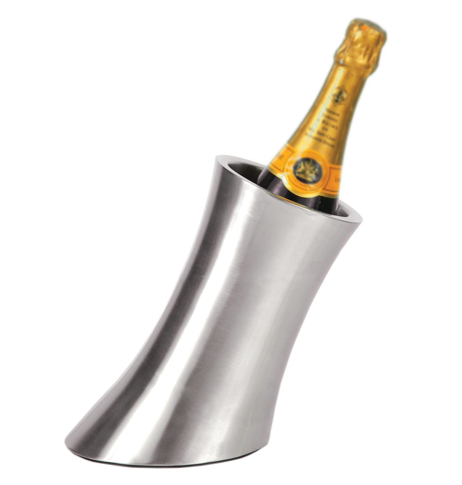 Angled and contoured to showcase wine with museum-worthy panache, our gleaming stainless steel bottle chiller is double-walled for full insulation and holds one standard bottle of white wine or bubbly until you’re ready to pop the cork. Quantity: 1 bottle chiller Material: Stainless steel Capacity: Fits 1 standard wine or Champagne bottle