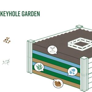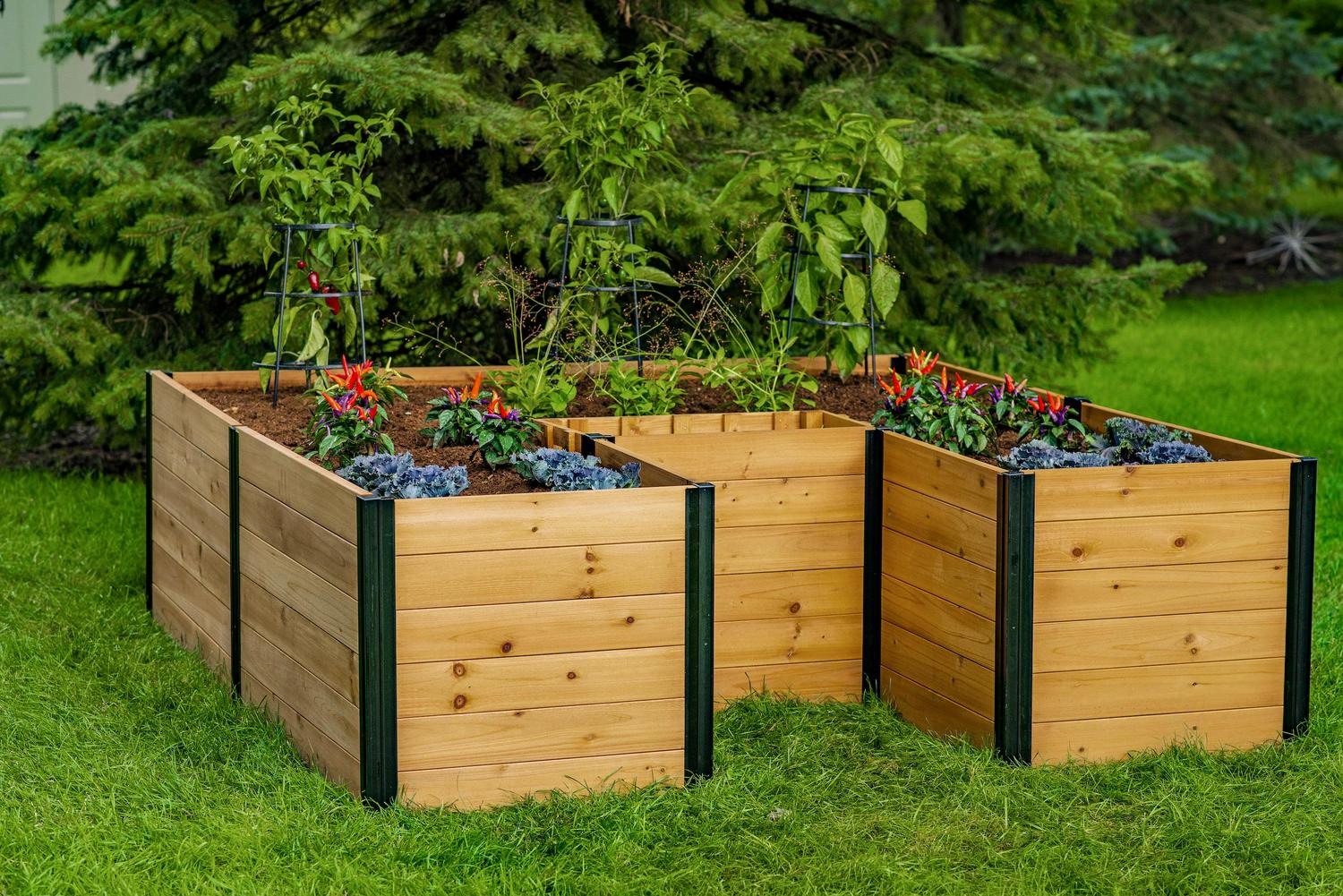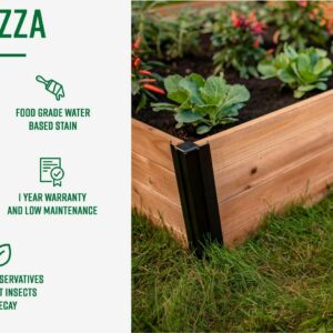 – Materials: Made from 100% FSC certified cedar lumber. Treated with an environmentally safe water-based stain. Posts are made from anodized aluminum. Compost household waste and grow fresh, organic vegetables in the same garden Color: Golden Brown 1-year limited warranty against manufacturing defects Recycles own box Requires minimal watering No soil turnover Natural Wood Grain Color Variation (No item has the same grain color, finish, or wood knots due to natural factors)