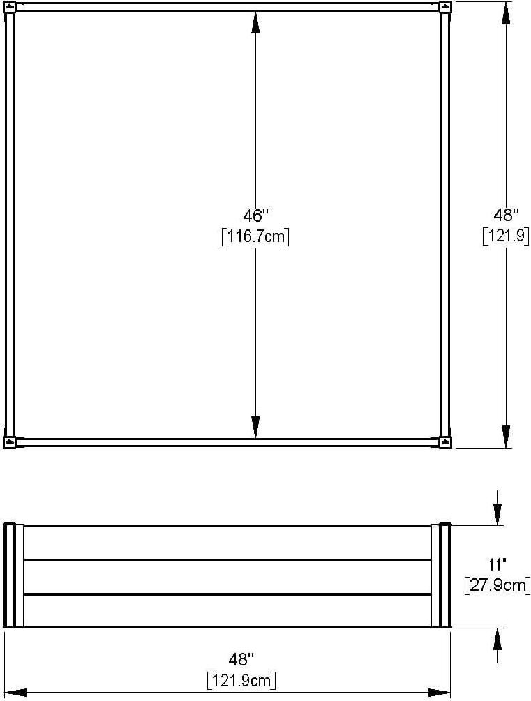 – Dimensions: 48 L x 48 W x 11 H (121.9cm L x 121.9cm W x 27.9cm H) Assembled Weight: 19 lbs (8.6 kg) Planting Area: 14.7 sq. feet (1.365 sq. m) Soil Capacity: 13.5 cubic feet (382.3 liters) Tools Required: No Product has no bottom floor Approx. Time Commitment: 1 person, 30 mins (additional time required for filling garden) Number of Boxes: 1