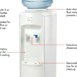 With a water dispenser in your home, clean and refreshing water is only a few feet away. The top-load standing water dispenser dispenses cold and room temperature water and can be used with a 3, 4 or 5 gallon water bottle or the Vitapur GWF8 water filtration system. Featuring a high efficiency compressor and adjustable thermostat, this dispenser provides icy cold water on demand, providing easy access to refreshing drinking water.
