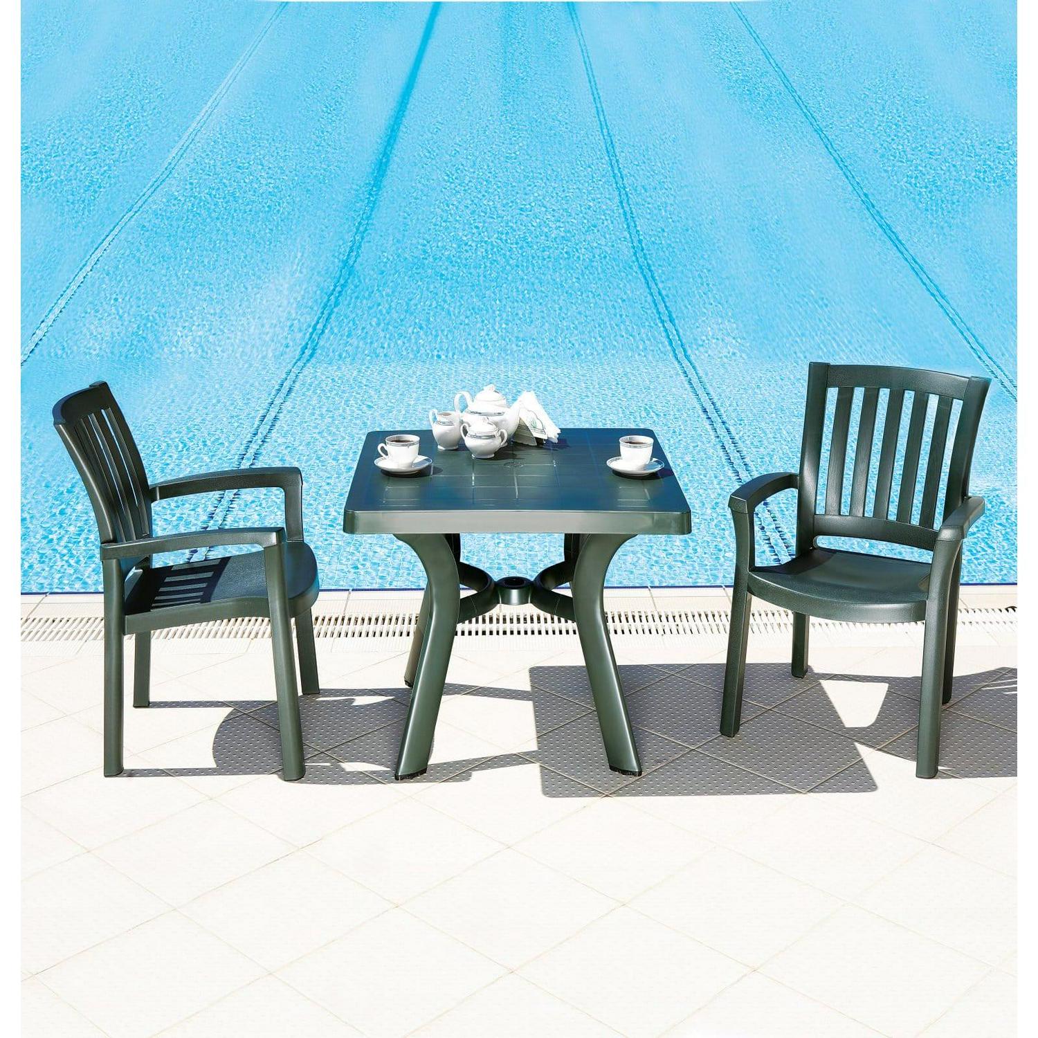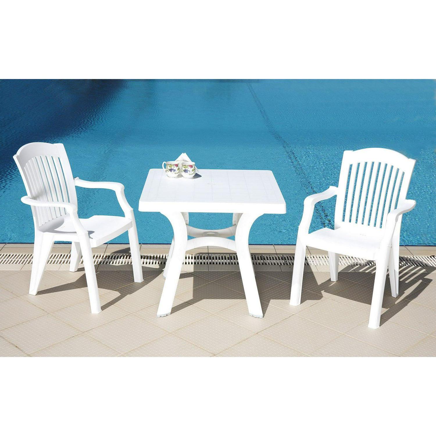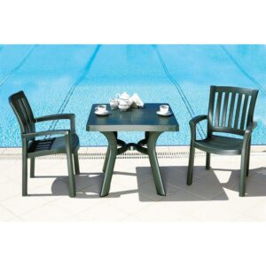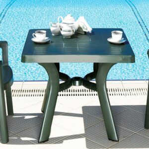 Viva square dining table. Strong and stable legs. Perfect for pool, beach and heavy use areas. Resistant to suntan oils, chlorine and saltwater. Has an umbrella hole and cap. Bottom piece is 14 inches high above the gorund for easy use with high umbrella bases. Easy cleaning. Product Dimensions : 31″L x 31″W x 29″H. Umbrella hole good for 1.5″ diameter poles. Bottom piece is 14″ high above the gorund