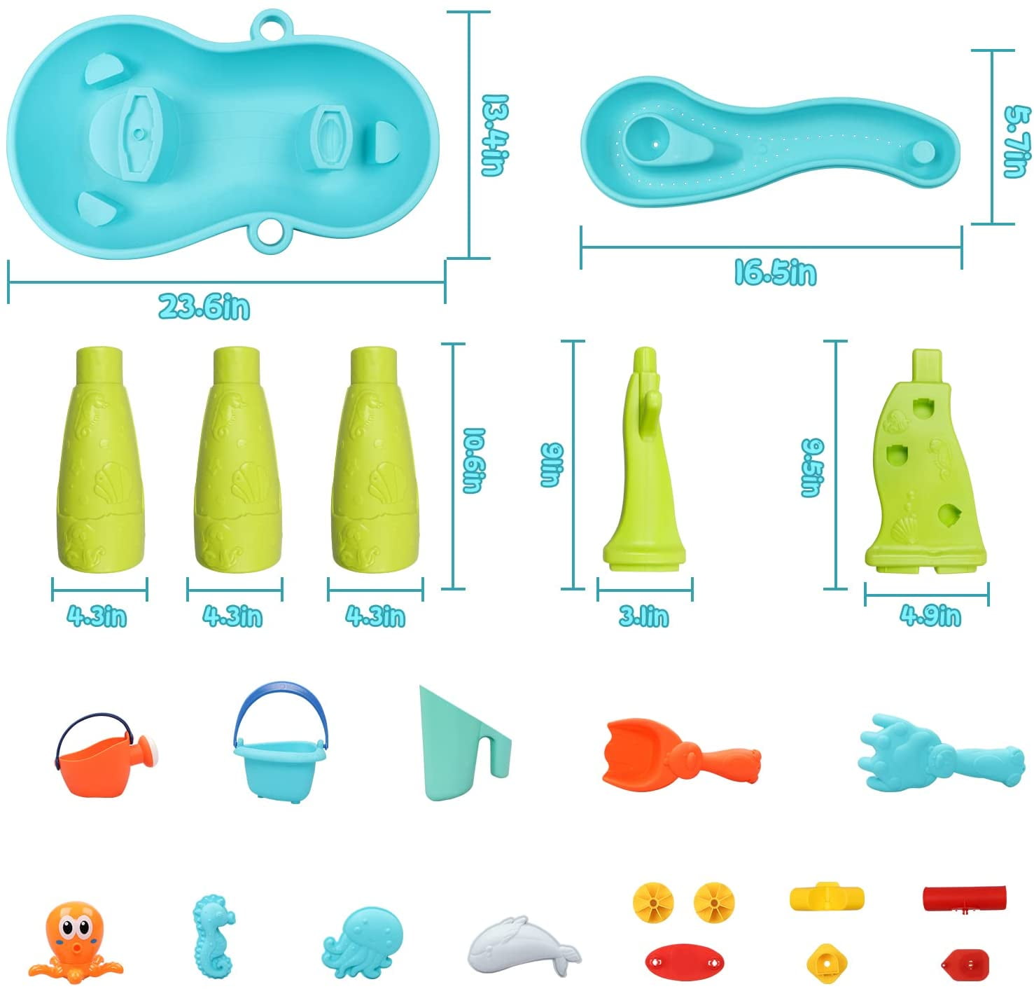 EASY TO CLEAN AND ASSEMBLE: This product is packaged in a gift box, easy to carry and assemble, made of high-quality durable materials and easy to clean. It is a good choice for daily family entertainment activities or holiday outdoor toys. Come and explore the fun of summer with your children. DOUBLE LAYER DESIGN: This brand new sand and water table (22.4*24.4*14.6inches) uses a double-layer structure design, the upper and lower layers can run together, and can hold water, sand, soil and anything else you can think of for creative exploration, Let the toddler start their wonderful journey. NICE SENSORY GAME: This water table for your kids will encourage children to do more tactile activities, pour sand and water into a funnel to watch the wheels turn, water a windmill to make a splash, pour water into a water tower to form a waterfall, press with a mold live animals etc. Enhance your child’s hand-eye coordination and imagination during these processes. STABLE AND SAFE: Our products are made of high-quality, non-toxic ABS material, tested by CPSIA and ASTM standards, the unique design of the water play table model is very stable and durable, the inner seat material is thicker, and the bearing capacity is higher, so that children don’t need to worry about safety issues And enjoy the summer life to the fullest. PERFECT SUMMER GIFT: Are you still worried about your child’s summer boring life, give this water table for your toddlers and It will never disappoint your child make it a gift for 3 4 5 6 7 8 + kids parties, birthdays, festivals, etc., is sure to make your child the center of attention, always immersed in the happy summer life.