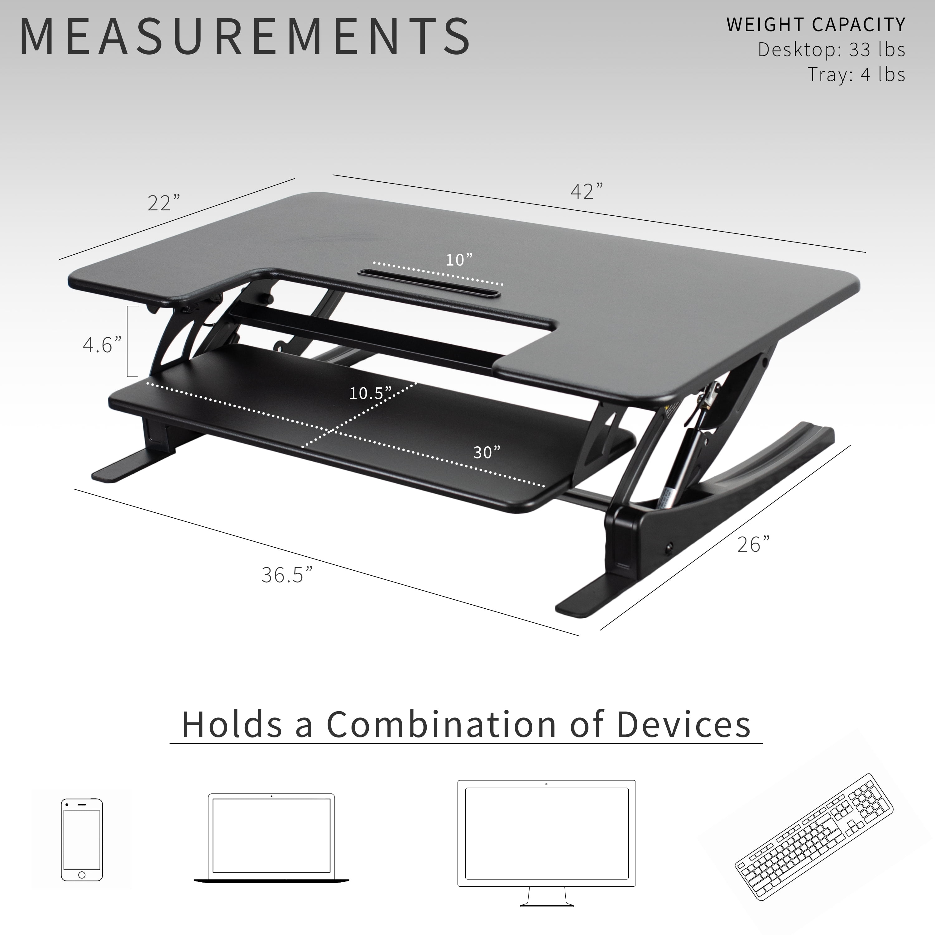Improve your work experience with the extra-wide height adjustable tabletop desk riser (DESK-V000VL) from VIVO! The dual-tiered platform sits on top of your current desk and gives you the benefit of standing or sitting throughout the long workday. This provides numerous health benefits for the body such as increased blood flow and reduced aches and pains. Standing throughout the day also helps the mind stay alert and productive. Counterbalance pneumatic springs adjust to the weight of your desk and everything on it for easy upwards movement. Find your perfect height level with unlimited adjustable points between 6 and 17 inches from the desk surface. All hardware and instructions are provided to get your new desk converter assembled for increased work comfort in no time! Specifications Color: Black Type: Manual Desktop Dimensions: 42″ x 22″ Keyboard Tray Dimensions: 30″ x 10.5″ Base Dimensions: 36.5″ x 26″ Height Adjustment Range: 6″ to 17″ Desktop Weight Capacity: 33 lbs Keyboard Tray Weight Capacity: 4 lbs