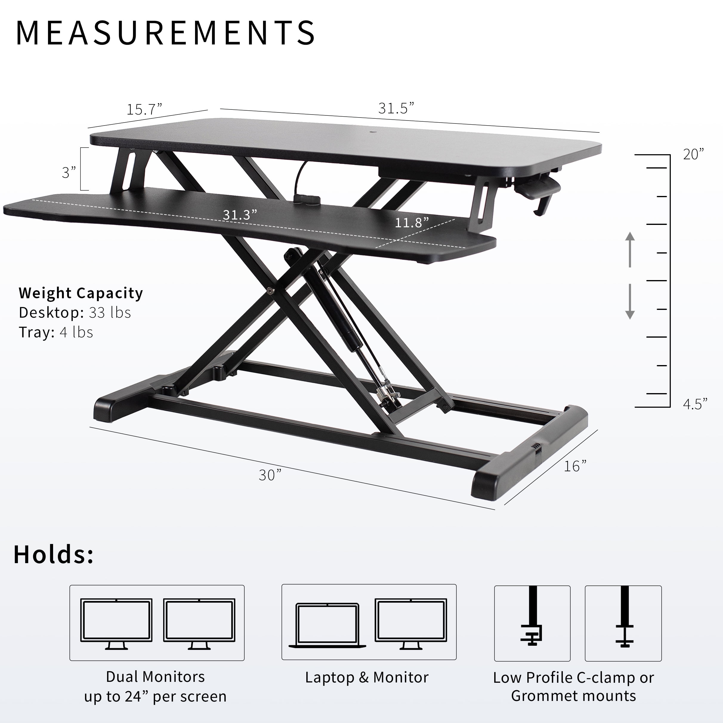 Create Instant Active Standing – VIVO’s desk riser provides on-demand standing throughout the day for the freedom to get out of your chair and relieve muscle tension, reduce stress, and increase productivity. –Patented– Space Efficient 31.5″ Surface – The top surface measures 31.5” x 15.7”, which maximizes space while still providing room for dual monitors. The 31.3″ x 11.8″ (10.5″ in center) keyboard tray raises in sync with the top surface to create a comfortable workstation. Strong 33 lbs Lift Assist – Go from sitting to standing in one smooth motion using the innovative simple touch height locking mechanism (Adjustment Range: 4.5″ to 20″). Lift design elevates straight upwards. Very Minimal Assembly – This riser is almost ready to go right out of the box! Place on your existing desk, attach the keyboard tray, and start organizing your workstation. We’ve Got You Covered – Sturdy, high-grade steel design is backed with a 3-Year Manufacturer Warranty and friendly tech support to help with any questions or concerns.