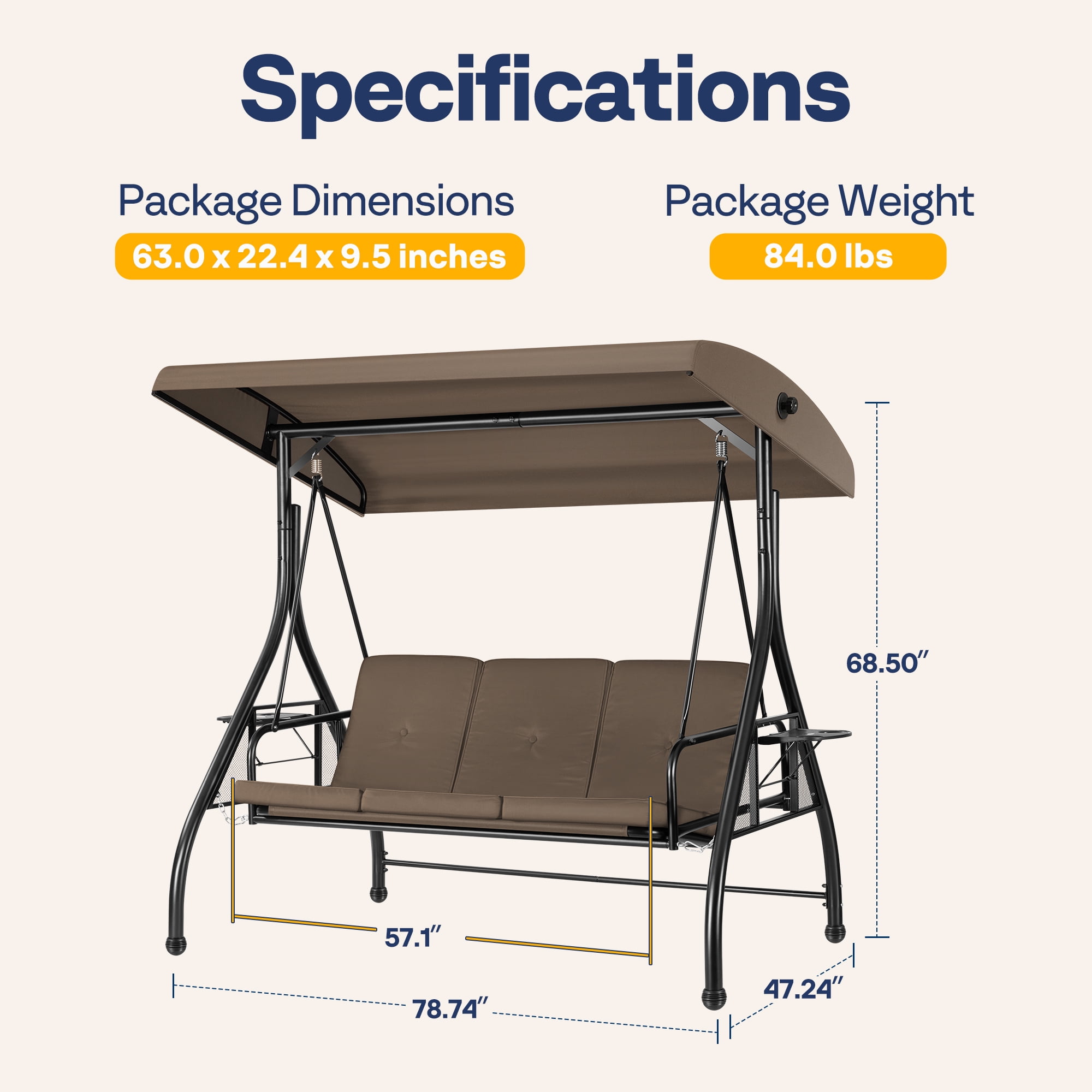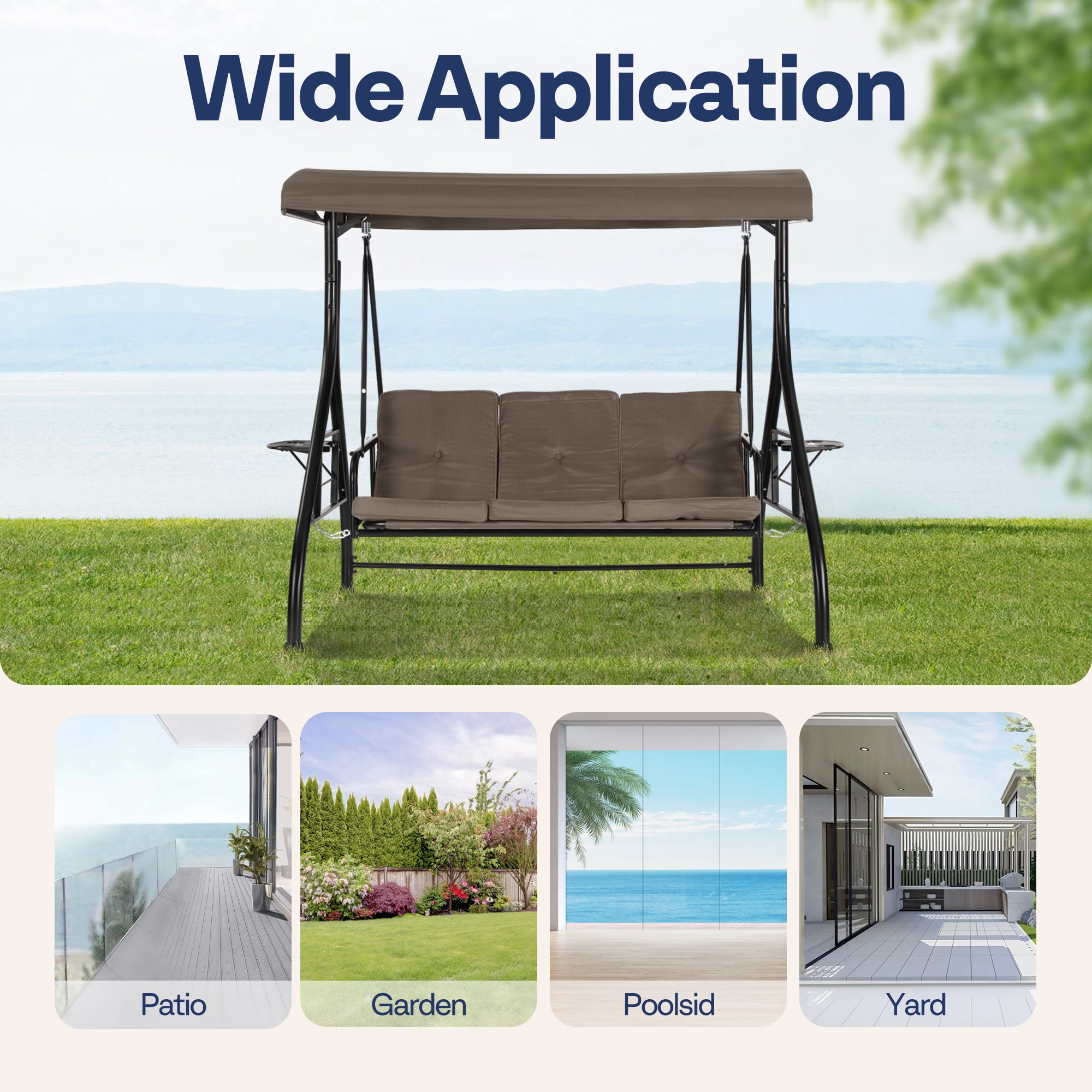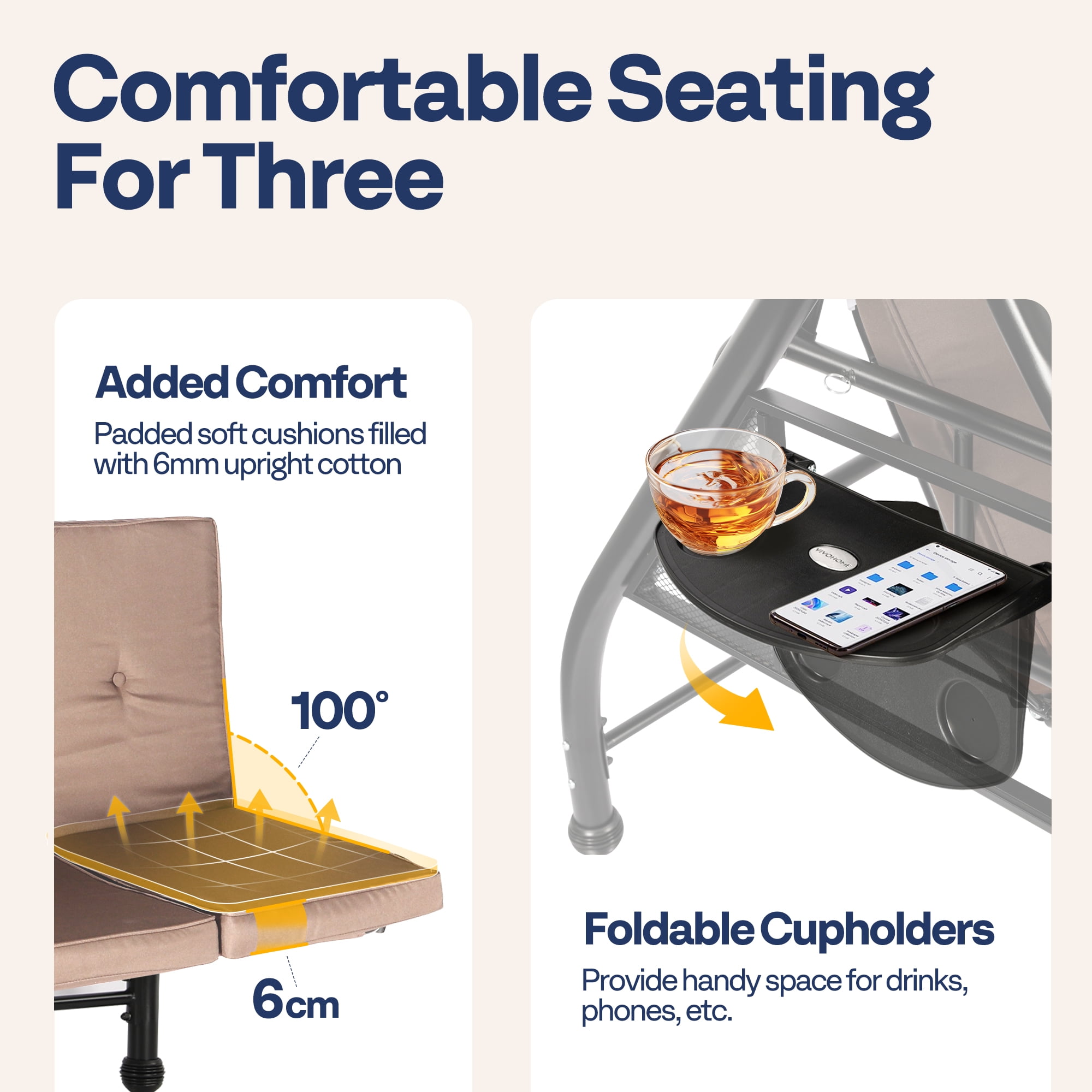 STRONG CONSTRUCTION – The VIVOHOME Swing Canopy Hammock 3 Seats boasts a strong construction with a sturdy steel frame; The triangle frame structure with powder-coated finish provides excellent stability and prevents rust and corrosion; The non-slip feet add an extra layer of security, keeping the hammock firmly in place; This construction can support up to 595 pounds (270kg), making it suitable for multiple users COMFORTABLE SEATING FOR THREE – Designed for ultimate comfort, the swing includes a spacious seat that accommodates up to three people; For added comfort, this swing chair includes thick padded soft cushions filled with 6mm upright cotton; Beside each of the armrests arrange a foldable cupholder for two cups, providing handy space for drinks, phones, etc.; Perfect for various daily outdoor settings, such as gardens, patios, porches, poolside, balconies and backyards ADJUSTABLE CANOPY FOR SHADE – Equipped with a protective canopy, the patio swing hammock offers shade from the sun, making it perfect for hot summer days; Made from 180 g/m2 polyester fabric, the canopy is breathable, waterproof and UV-protected; The canopy can be easily adjusted to the desired angle with the rotary knob, provide the right spot of shade from sun damage and mild rain; If you want to sunbathe, just remove the canopy 2-IN-1 SWING CHAIR / BED – Designed with a simple changing structure, this porch swing can turn into a bed quickly; You only need to flatten the backrest by unlocking the seat’s side buckles, in this way you can get a comfortable bed; The spring hooks ensure a smooth and quiet rocking motion; Whether chatting, swinging or napping, this porch swing bed meets your need EASY ASSEMBLY & MAINTENANCE – The outdoor porch swing is designed for easy assembly, with all necessary hardware and clear instructions included; The removable cushions and canopy covers make cleaning and maintenance simple and convenient; Enjoy hassle-free assembly and immediate relaxation