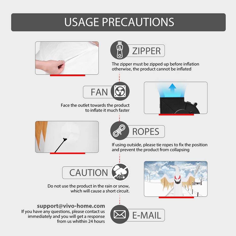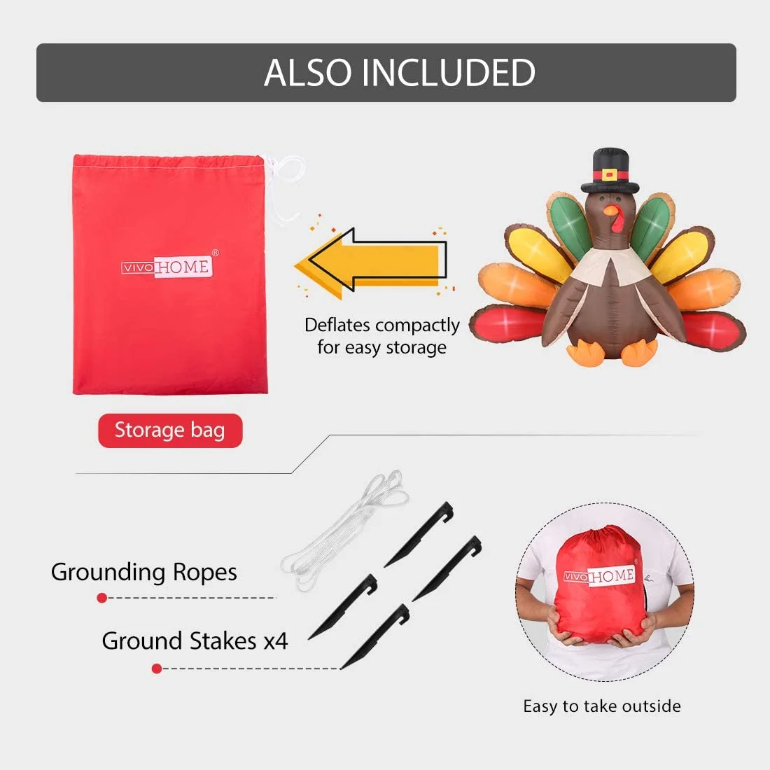 VIVOHOME 5ft Height Thanksgiving Inflatable LED Lighted Turkey with Hat Blow up Outdoor Yard Decoration EXCELLENT FESTIVAL DECORATION & QUICK INFLATION & HOLIDAY ACCENT & LOW NOISE Which is the best decoration in Thanksgiving? Inflatable lighted turkey is the most popular decoration beyond question. Whether you’re an adult, a teen, or a child, they will be fascinated by the impressive design at the first sight, deeply catching people’s attention. Equipped with waterproof charger, built-in fan, ropes and ground stakes, which can ensure safety and stability, even children are allowed to be indulged in playing with the unique lighted turkey during the holiday season. Comes with interior white LED lights to bring some happy atmospheres to your neighbors, friends, and families for extra holiday cheer. Don’t worry about the storage problem, the great design allows people to store quickly and easily with the included bag. Features low noise, our product only makes a little noise when operating in the room; If put in the outdoor, the noise can be neglected. Creating a fun, memorable scene in your home or on your lawn during the holiday season; Plus there are tethers on both sides of the product, keeping it secure to the ground. Know More About Product Product Specification: Material: Polyester Condition: 100% Brand New Pattern: Lighted Turkey with Hat Package Dimensions: 10.2*7.9*7.9 inch Item Weight: 4.62lbs Package Include: 1 x Inflatable Yard Decor 4 x Ground Stakes 2 x Ropes Bright Light With LED light flicking interior the turkey, it easily catches attentions and brings some happy atmosphere to your friends and families. Sealed Zipper There is 1 zipper near the inflation fan, remember ZIP it UP before inflating the turkey. Powerful Fan Furnished powerful 1A inflation fan, it quickly inflates and keeps the turkey inflated all the time.