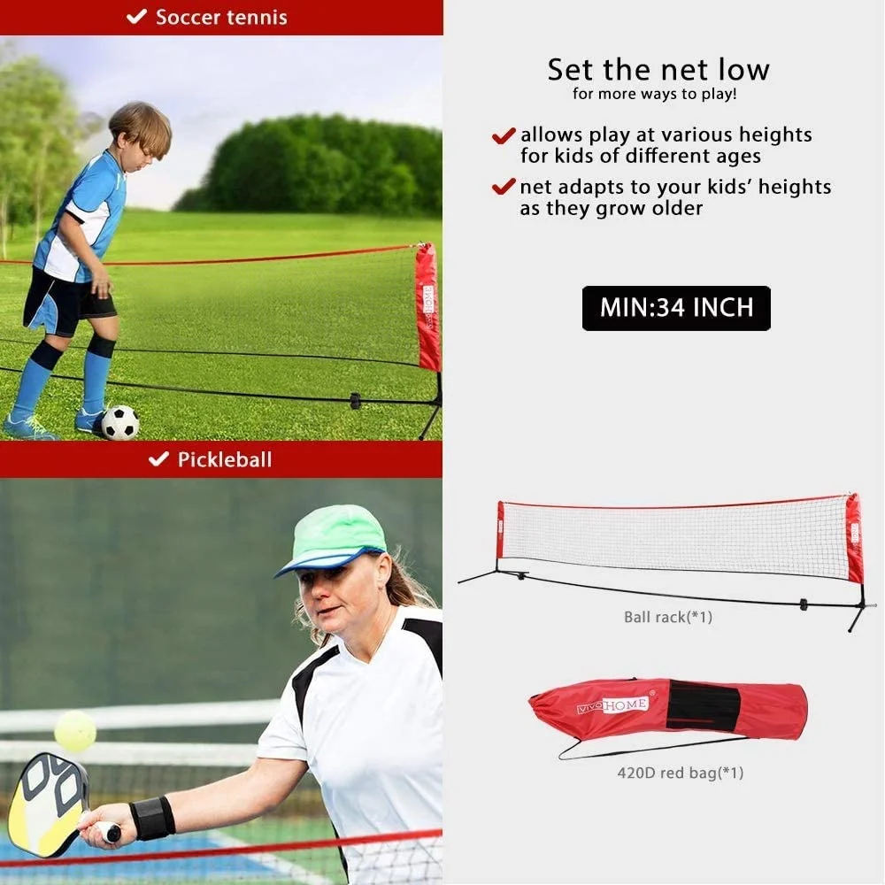 VIVOHOME 14 Ft Outdoor Badminton Net Set Large Net Size & Stable Ground Frame & Folable Set Up & Portable Carrying Bag & Space Saving VIVOHOME Mutifunctional practice net is constructed with iron frame and polyester net, extremely durable design brings a serious work-out time after time, suitable for playing kid volleyball, badminton, pickleball, and soccer tennis. With a set-up time of only 90 seconds it means less hassle and more time to play. A perfect recreational net for outdoor and indoor use. Sturdy Netting The netting with 1.6″ x 1.6″ grids makes it possible to take the hardest hit or throw and last long. Elastic Cords 4 elastic cords are attached on netting corner to tension the whole net and keep it fixed. Tube Holder The foam tube holder attached on main stand is to fix folded tubes for easy storage. Tube Connector Equipped with 4-end tube connects allows for simple and rapid assembly & disassembly. Strong 3-ply knotless netting along with a durable frame assures a great gaming experience of team ball. The super thick frame adds great rigidity and weight for the base and you can concentrate well on the game. With an adjustable height design, you can instantly set the net from high to low. With a compact carrying bag, portable and convenient, you can practice anywhere and anytime. 3 length sizes is for optional selection. You can choose the size due to the amount or ages of members. Product and package information Material: Metal stand + PE netting + Polyester Cloth Color: Black + Red Tube: Adjustable outer tube 0.87″ (D), others 0.75″ (D), Thickness 0.03″ 1 x Netting 1 x Net Rack 1 x Carrying Bag 1 x User Manual