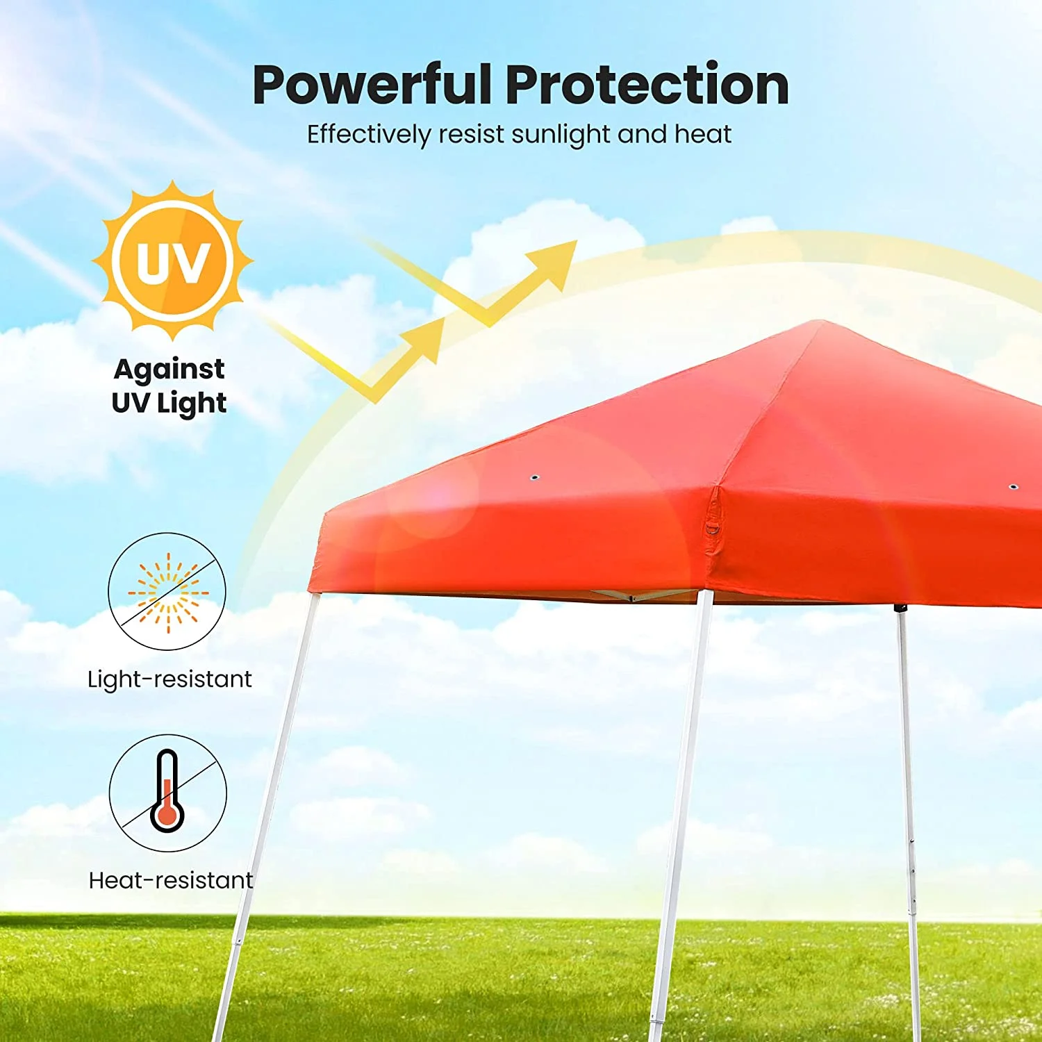 CONSIDERATE DESIGN – Designed for the outdoors, this instant canopy provides quick and easy shade and shelter for almost any activity; There are 3 heights that can be adjusted, 57.9, 62 and 66.1 inches, which can meet your demands in different situations DURABLE MATERIAL – Made with high-quality 210D Oxford fabric, which is not only waterproof but also can extend its service life; Equipped with the premium, rust-resistant white powder-coated steel frame and base, this hard-wearing canopy can be used in every season EASY TO USE – It comes complete with a black zippered carrying bag, 8 ground stakes and 4 anchor ropes to easily secure for outdoor use; The hook and loop fasteners design is easier for you to set up or remove the canopy LABOR SAVING – With a quick and easy assembly, setting up or taking down the tent can be done by 1 person; 4 control buttons on the steel frame can help you save your strength when you are ready to put this tent away WIDE USAGE – The sunshade area of this tent is larger and can accommodate multiple people at the same time; Perfect for family gatherings, picnics, camping, beach trips, barbecues or any outdoor occasion
